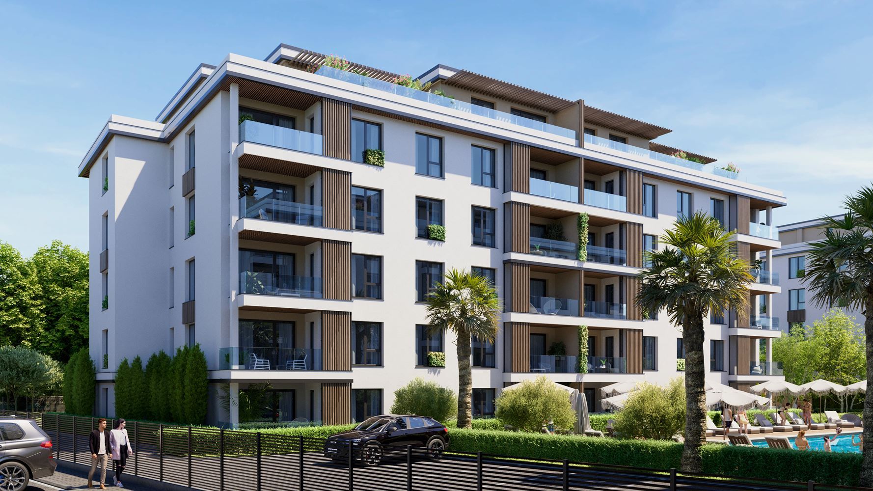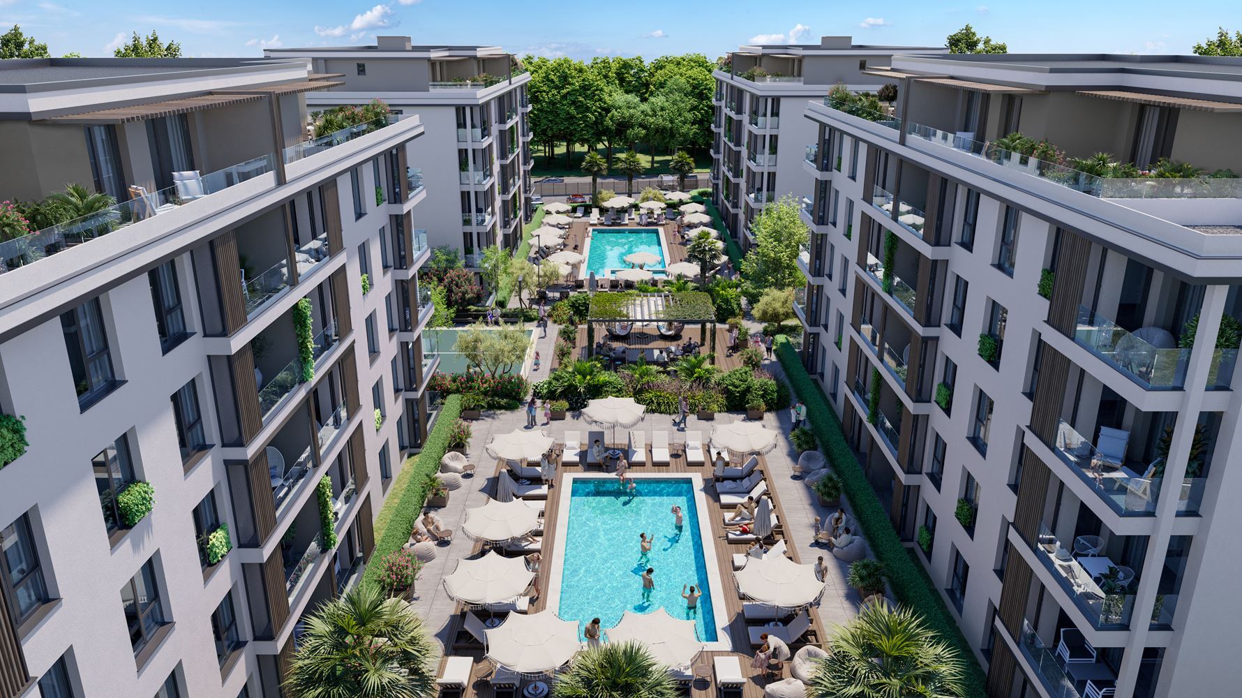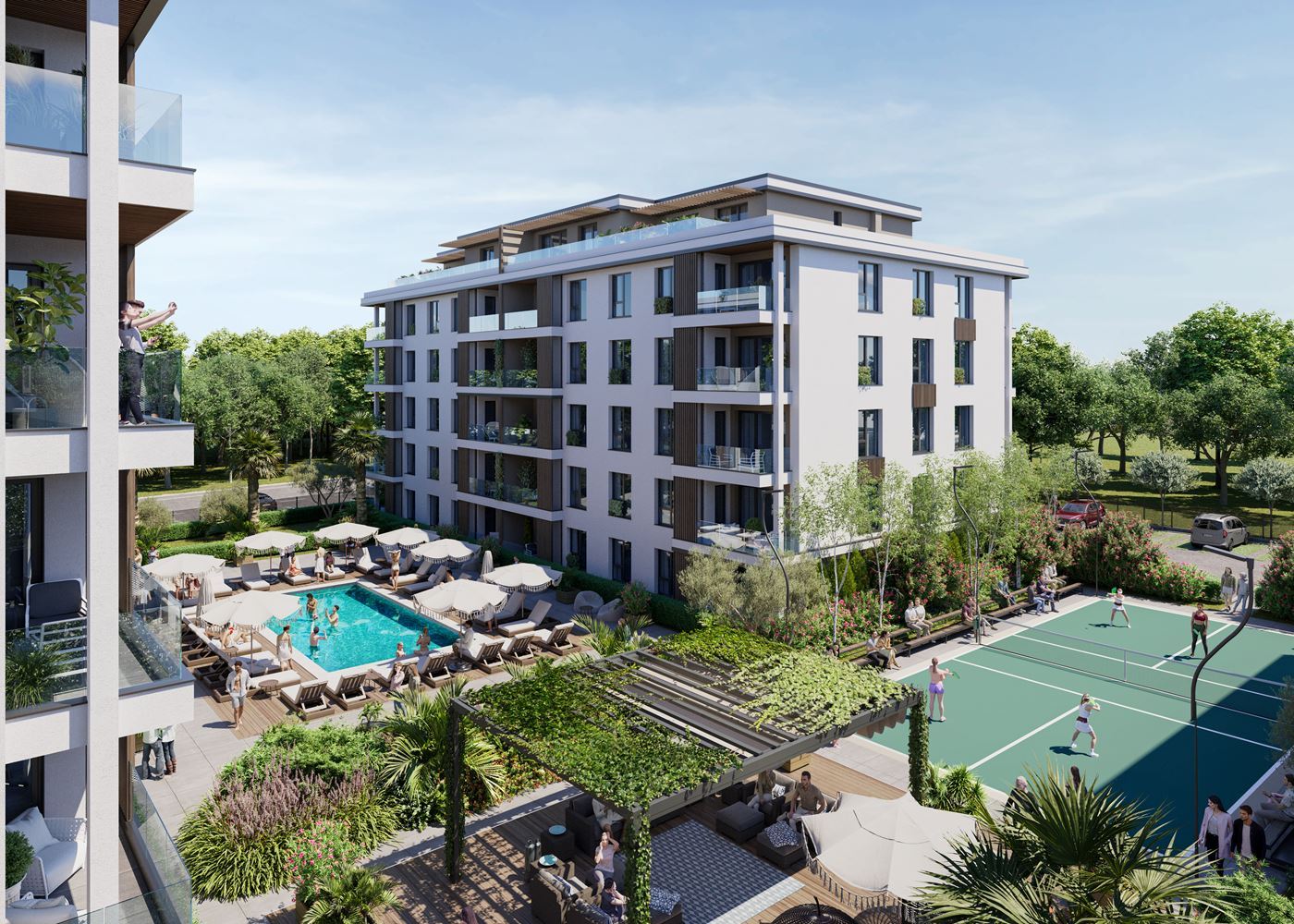 Der Komplex ist auf komfortables und hochwertiges Wohnen ausgelegt. Den Bewohnern stehen Grünflächen, zwei Schwimmbecken, ein Kinderspielplatz, eine Erholungszone sowie ein Pickleball- und Badmintonplatz zur Verfügung, was ihn sowohl für Familien mit Kindern als auch für aktive Menschen geeignet macht. Parkplätze sind vorhanden, mit der Möglichkeit, Außenstellplätze zu erwerben, sowie 24-Stunden-Sicherheitsdienst, der Ruhe und Sicherheit gewährleistet.