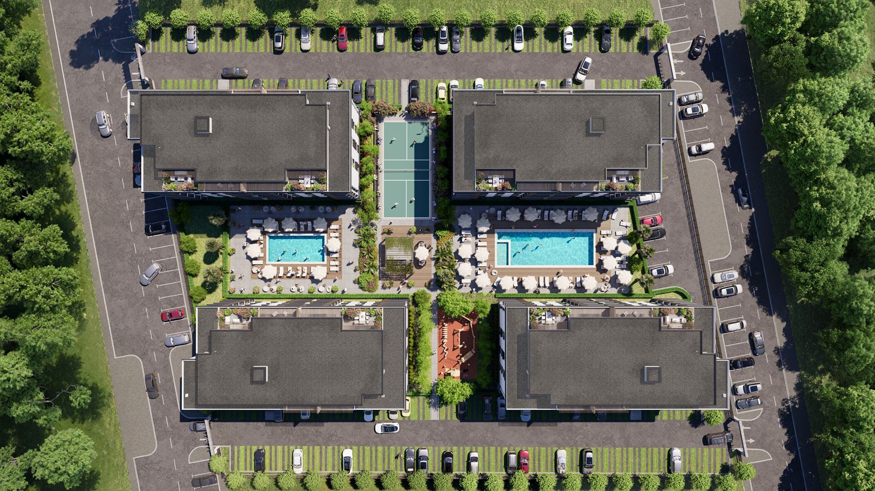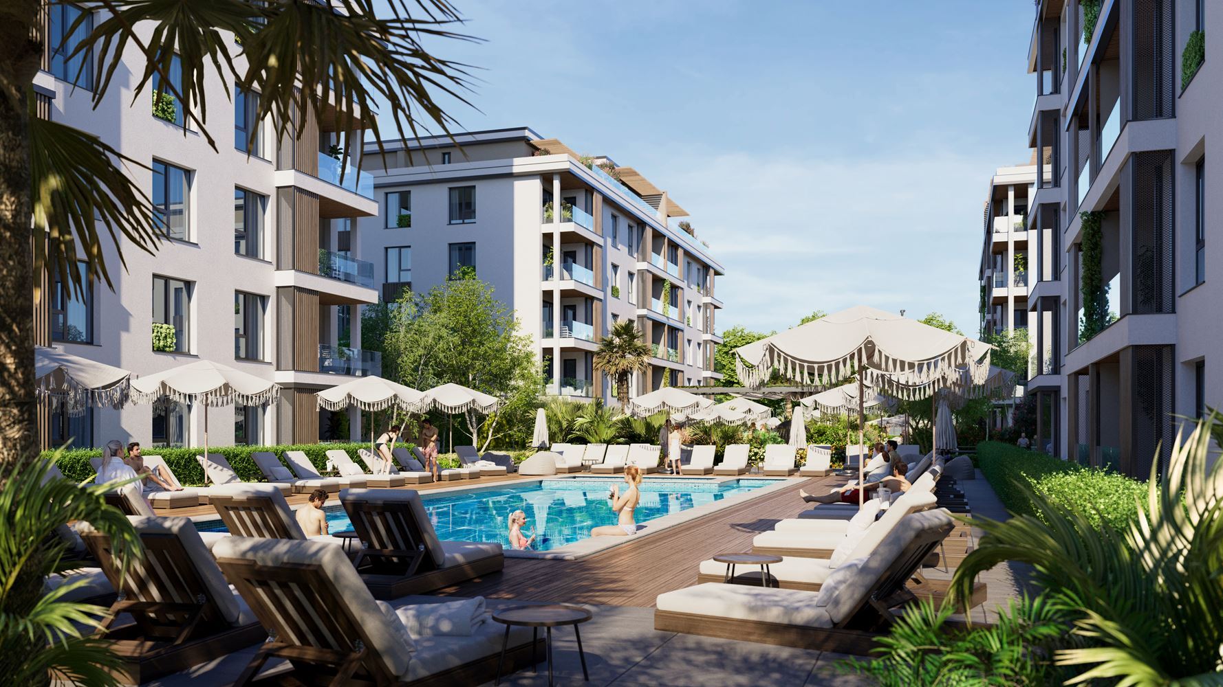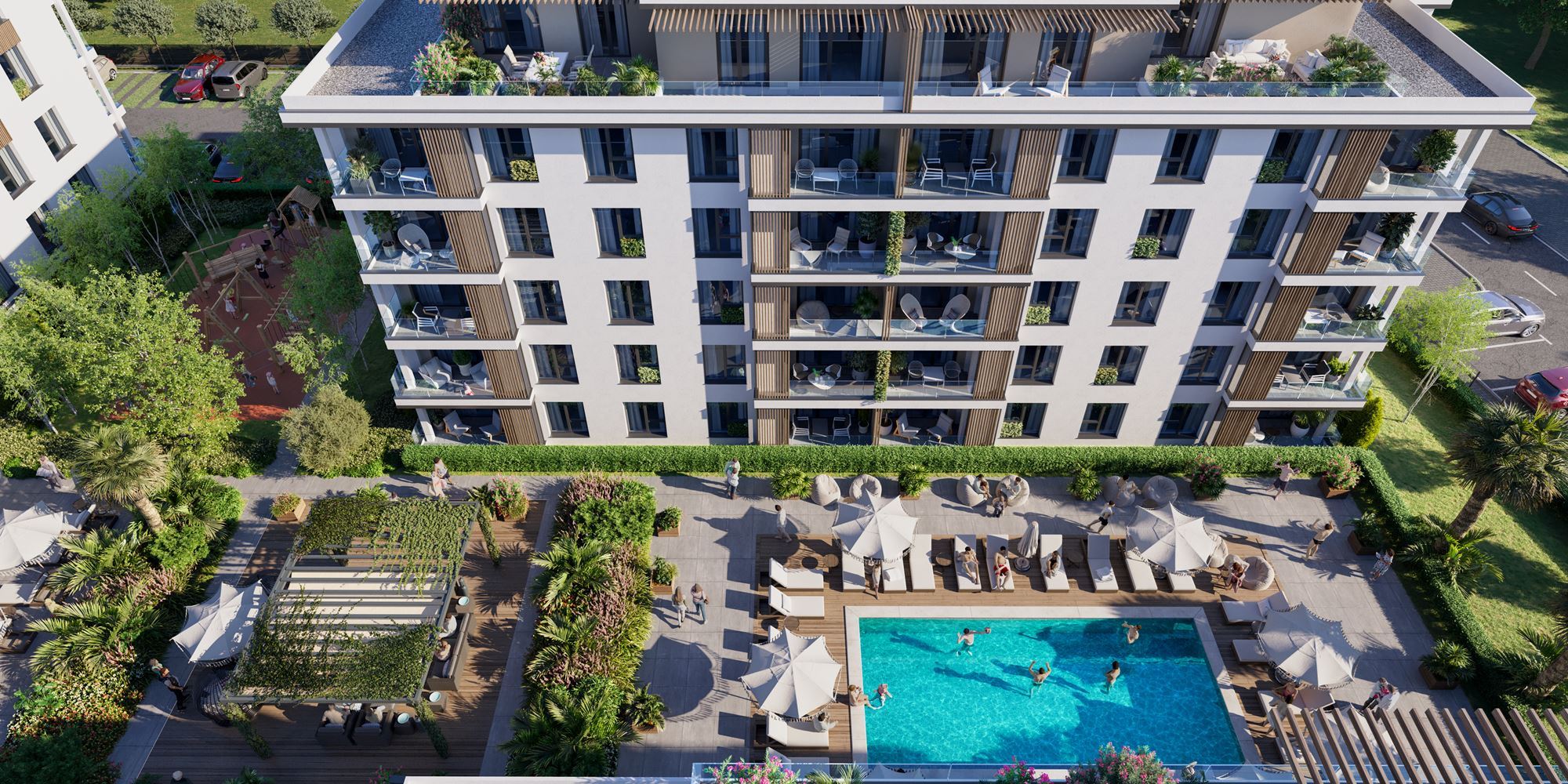 Der Komplex ist auf komfortables und hochwertiges Wohnen ausgelegt. Den Bewohnern stehen Grünflächen, zwei Schwimmbecken, ein Kinderspielplatz, eine Erholungszone sowie ein Pickleball- und Badmintonplatz zur Verfügung, was ihn sowohl für Familien mit Kindern als auch für aktive Menschen geeignet macht. Parkplätze sind vorhanden, mit der Möglichkeit, Außenstellplätze zu erwerben, sowie 24-Stunden-Sicherheitsdienst, der Ruhe und Sicherheit gewährleistet.