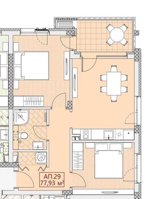 Die Wohnung hat eine Gesamtfläche von 78,84 m² und befindet sich im vierten Stock. Die Aufteilung ist funktional und gut durchdacht und umfasst einen Eingangsbereich, ein geräumiges Wohnzimmer mit Küchenbereich, zwei separate Schlafzimmer, ein Badezimmer mit Toilette und eine Terrasse, die sich zum Entspannen eignet. Die Wohnung wird schlüsselfertig, ohne Möbel angeboten, was den neuen Eigentümern die Möglichkeit gibt, sie vollständig nach ihrem Geschmack und Stil einzurichten.