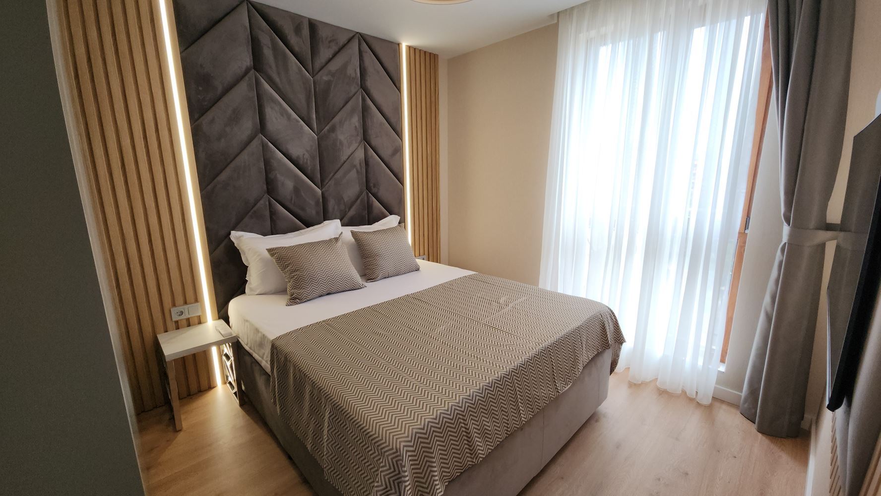 Die Wohnung überzeugt durch eine bequeme und praktische Raumaufteilung, bestehend aus einem großzügigen Wohnzimmer mit Küchenbereich, zwei separaten Schlafzimmern, einem Badezimmer mit Toilette und einer Terrasse. Die Räume sind gut organisiert und mit viel Tageslicht durchflutet, was eine gemütliche und harmonische Atmosphäre schafft, geeignet sowohl für ganzjähriges Wohnen als auch für Urlaubszwecke. Die Immobilie wird voll möbliert und ausgestattet, in ausgezeichnetem Zustand und bezugsfertig angeboten.