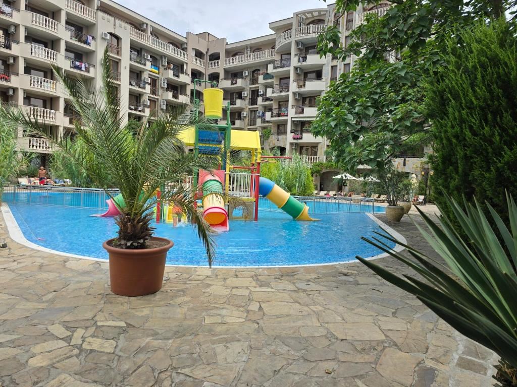 Für Liebhaber eines aktiven Lebensstils und von Unterhaltung bietet die Anlage zwei Mini-Aquaparks für Kinder und Erwachsene sowie drei Fitnesszentren, von denen eines im Freien liegt und Training in grüner Umgebung und frischer Luft ermöglicht. Den Eigentümern und Gästen stehen außerdem ein SPA-Zentrum und eine Sauna, ein Schönheitssalon sowie drei Restaurants mit internationaler Küche zur Verfügung, die das Gefühl eines vollständigen Urlaubs ohne Verlassen der Anlage abrunden. Zusätzlichen Komfort bieten zwei Bars, ein Supermarkt mit breitem Sortiment sowie ein eigener Gemüsegarten für den Anbau und Verkauf frischer Qualitätsprodukte. Ein besonderer Vorteil und eine echte Seltenheit für die Region ist der einzige 50-Meter-Swimmingpool in Sonnenstrand, ausgestattet mit einem speziellen Wasserfiltersystem, das ihn sowohl für sportliches Schwimmen als auch für Entspannung bei maximalem Komfort und Hygiene ideal macht.