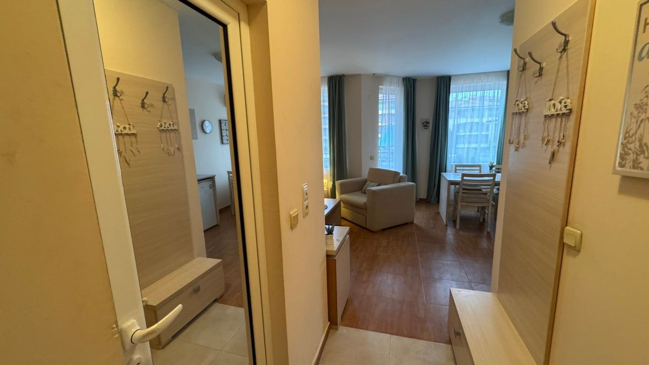 Wir präsentieren Ihnen ein äußerst attraktives und modern eingerichtetes Studio, gelegen in einer prestigeträchtigen, ganzjährig geöffneten Anlage im Ferienort Sweti Wlas – ein Ort, an dem sich Meeresbrise, Bergfrische und Ruhe in perfekter Harmonie vereinen. Die Immobilie befindet sich im zweiten Stock eines fünfstöckigen Gebäudes und bietet eine funktionale Raumaufteilung auf einer Gesamtfläche von 42.47 m², die Gemütlichkeit, Stil und Praktikabilität vereint.