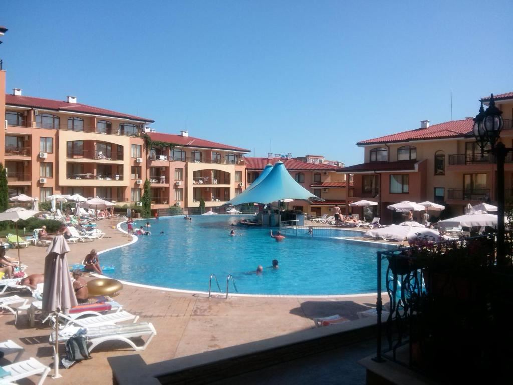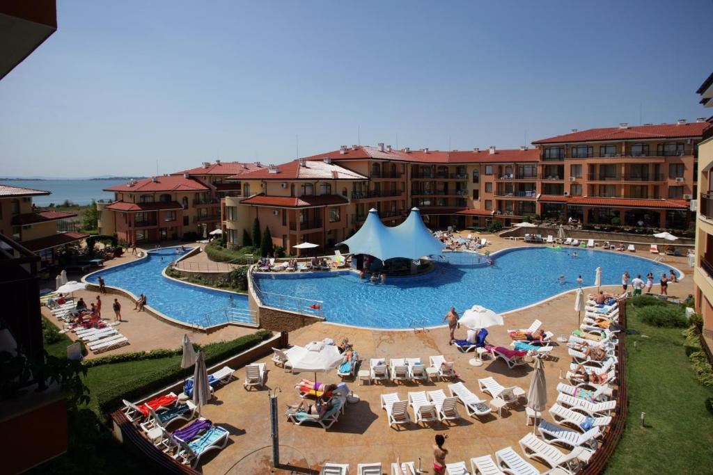 Elegantes Studio mit Blick auf den Pool in einer Anlage in Sweti Wlas