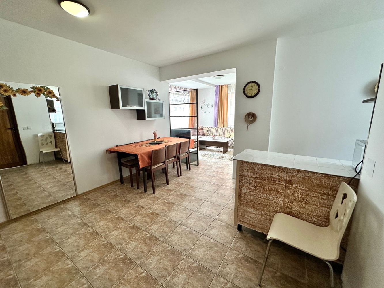 Die geräumige Wohnung bietet einen einladenden Eingangsbereich, ein helles Wohnzimmer mit separater Küche, zwei Schlafzimmer, zwei Badezimmer mit WC und eine große Terrasse mit Blick auf den gepflegten Innenhof und den Pool. Die Aufteilung ist äußerst praktisch und sorgt für klare Bereiche zum Entspannen, Essen und Schlafen – ideal für den Familienalltag.