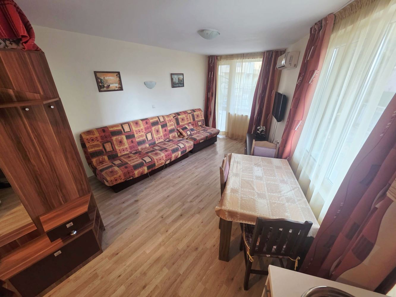 Die Wohnung verfügt über eine reale Wohnfläche von 29 m², ohne Terrasse, und ist praktisch geschnitten, um maximalen Komfort und Funktionalität zu gewährleisten. Sie besteht aus einem Eingangsbereich, einem geräumigen Badezimmer mit Fenster, das natürliches Licht und gute Belüftung bietet, sowie einem hellen Wohnraum mit kombinierter Wohn- und Esszone. Trotz der kompakten Größe bietet das Studio ausreichend Platz für den Alltag.