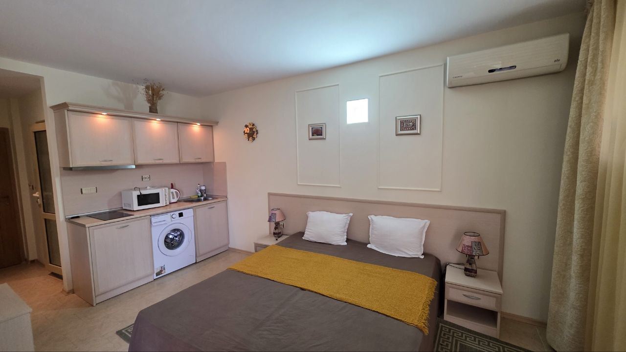 Wir präsentieren eine großartige Gelegenheit für ein Zuhause oder eine Investition in einem der begehrtesten Seebäder Bulgariens – Sunny Beach. Das Studio befindet sich im Erdgeschoss und besticht durch funktionalen Raum und leichten Zugang, geeignet sowohl für die Nutzung in der Saison als auch für ganzjähriges Wohnen. Mit einer Gesamtfläche von 44,30 m² bietet die Immobilie eine komfortable Aufteilung: ein helles, praktisches Zimmer mit Platz für einen Wohn- und Schlafbereich, ein separates Bad mit Toilette und ein angenehmer Balkon für Morgenkaffee oder abendliche Entspannung. Die Lage im Erdgeschoss ist ideal für Familien mit kleinen Kindern, Menschen mit Mobilitätseinschränkungen oder jeden, der einfachen Zugang schätzt. Das Gebäude verfügt zudem über einen Aufzug für maximalen Komfort beim Transport von Gepäck und Alltagsbedarf.