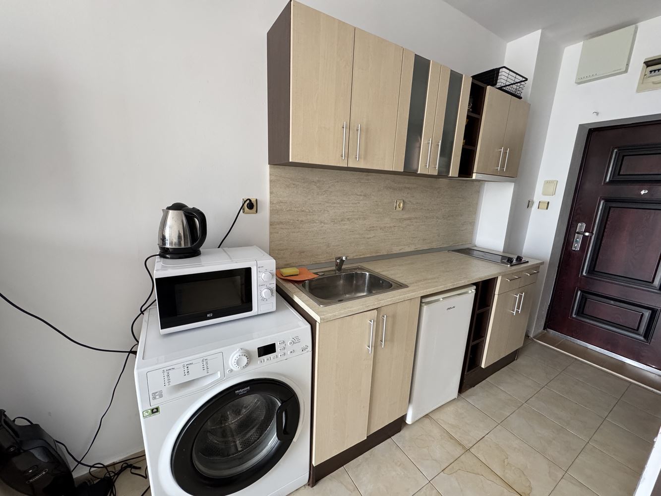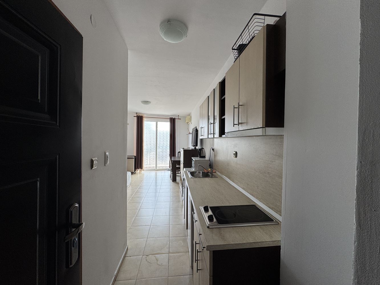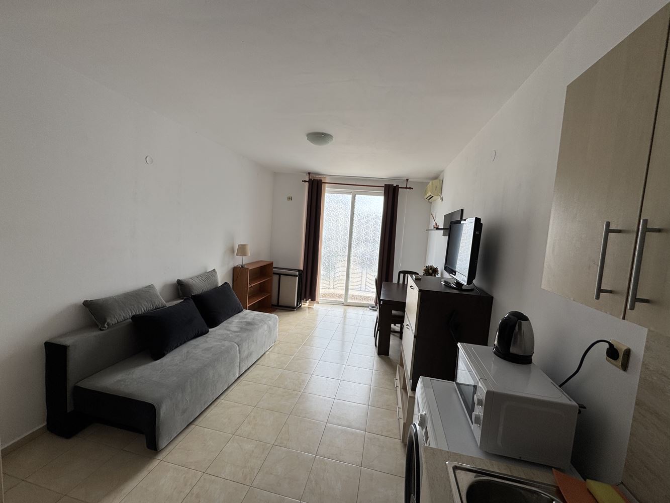 Wir bieten zum Verkauf ein kompaktes und funktionales Studio, gelegen in einem gut gepflegten Ferienresort im Sunny Beach Resort. Die Immobilie hat eine Fläche von 29 m² und befindet sich im zweiten Stock von drei, was sie leicht zugänglich und äußerst geeignet macht, sowohl für die persönliche Nutzung als auch als Investition für die Vermietung in der Sommersaison. Das Studio wird vollständig möbliert und bezugsfertig angeboten. Das Interieur ist praktisch organisiert und schafft eine gemütliche Atmosphäre, wobei alles Notwendige für einen komfortablen Aufenthalt bereitgestellt wird. Der geräumige Raum kombiniert einen Wohn- und Schlafbereich, eine Küchenzeile und ein Badezimmer mit Toilette. Vom Apartment aus hat man einen angenehmen Blick auf den Pool, der das Gefühl von Urlaub und Entspannung verstärkt.