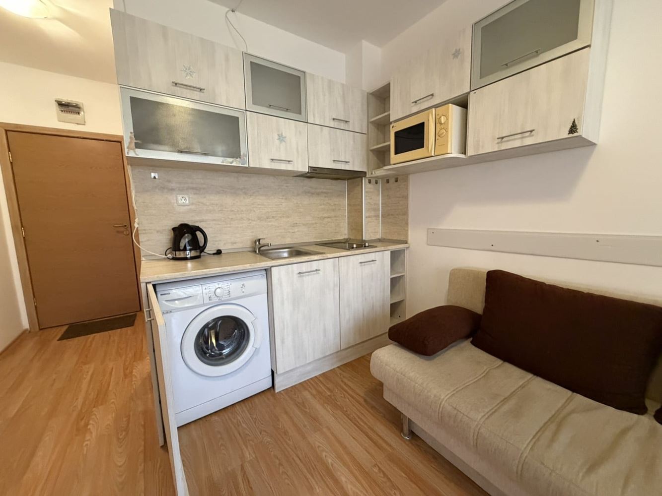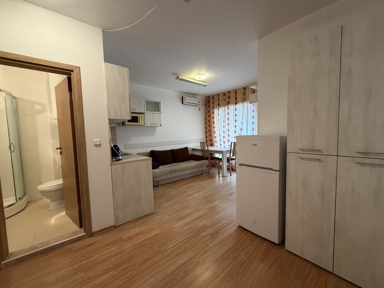 Wir präsentieren Ihnen eine gemütliche Wohnung mit zwei Schlafzimmern mit einer Fläche von 70 m², gelegen im hohen Erdgeschoss in einer ruhigen Gegend am Stadtrand von Sonnenstrand. Die Immobilie bietet ein ausgezeichnetes Gleichgewicht zwischen Ruhe, Nähe zur Natur und bequemem Zugang zu allen Attraktionen des Resorts. Die Wohnung verfügt über zwei Terrassen, die zusätzlichen Raum zur Erholung im Freien bieten und ein Gefühl von Weite und Verbindung mit der окружаenden Umgebung schaffen. Die funktionale Aufteilung ermöglicht ein komfortables Wohnen sowohl für Familien als auch für Personen, die ein Feriendomizil fern vom Lärm der zentralen Bereiche suchen. Die Räume sind hell und einladend und schaffen eine gemütliche Atmosphäre für den Alltag und die Erholung.
