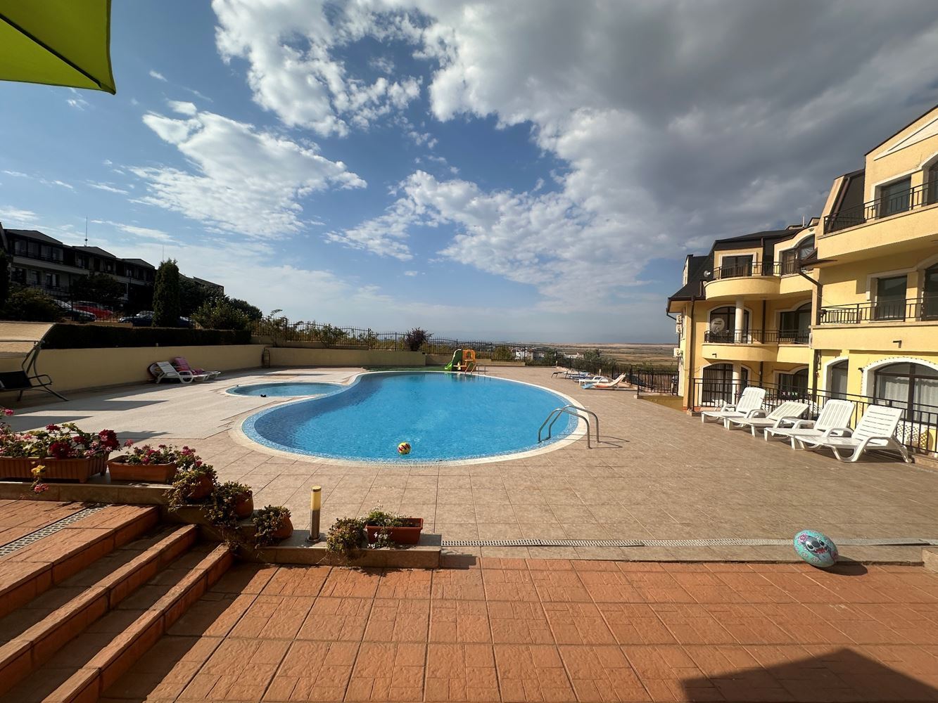 Wir bieten eine Dreizimmerwohnung mit einer Fläche von 94 m², gelegen im Erdgeschoss eines gemütlichen und ruhigen Komplexes am Stadtrand von Sunny Beach. Die Immobilie beeindruckt durch geräumige Zimmer und eine praktische Struktur, die Komfort und Funktionalität für jedes Familienmitglied bietet. Der größte Vorteil der Wohnung ist die große Veranda mit direktem Zugang zum Pool, die ein Urlaubsgefühl vermittelt und die Möglichkeit für angenehme Entspannungs- und Unterhaltungsmomente in den warmen Monaten bietet. Die Wohnung ist so angeordnet, dass sie maximalen Komfort und Bewegungsfreiheit bietet. Die beiden Schlafzimmer sind hell und gemütlich, und der Wohnbereich ist groß genug, um eine angenehme Atmosphäre für Familientreffen und tägliche Aktivitäten zu schaffen. Der direkte Ausgang zur Veranda und zum Pool macht die Immobilie besonders geeignet für Menschen, die Komfort und einfachen Zugang zu Entspannungsbereichen suchen.