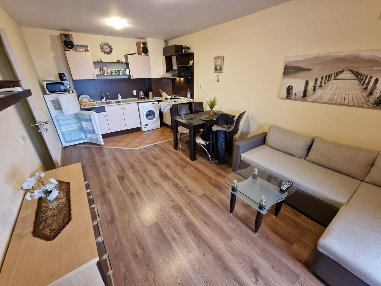 Die Wohnung verfügt über ein geräumiges Wohnzimmer mit Küchenzeile und Essbereich, ein separates Schlafzimmer, ein Badezimmer mit Toilette und eine Terrasse, auf der Sie die frische Luft und ruhige Momente genießen können. Das Interieur ist hell und funktional, bietet Komfort und Bequemlichkeit für ganzjähriges Wohnen oder Ferienaufenthalte.