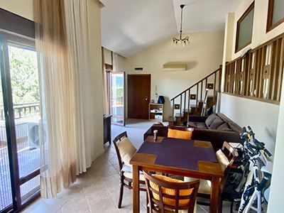 Auf der ersten Ebene befindet sich ein helles und großzügiges Wohnzimmer mit Küche, mit Zugang zu einer großen Terrasse mit beeindruckendem Panoramablick auf Meer und Berge. Dieser Bereich eignet sich ideal für Entspannung, Morgenkaffee oder ruhige Abende inmitten der Natur.