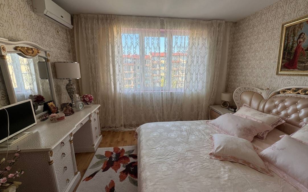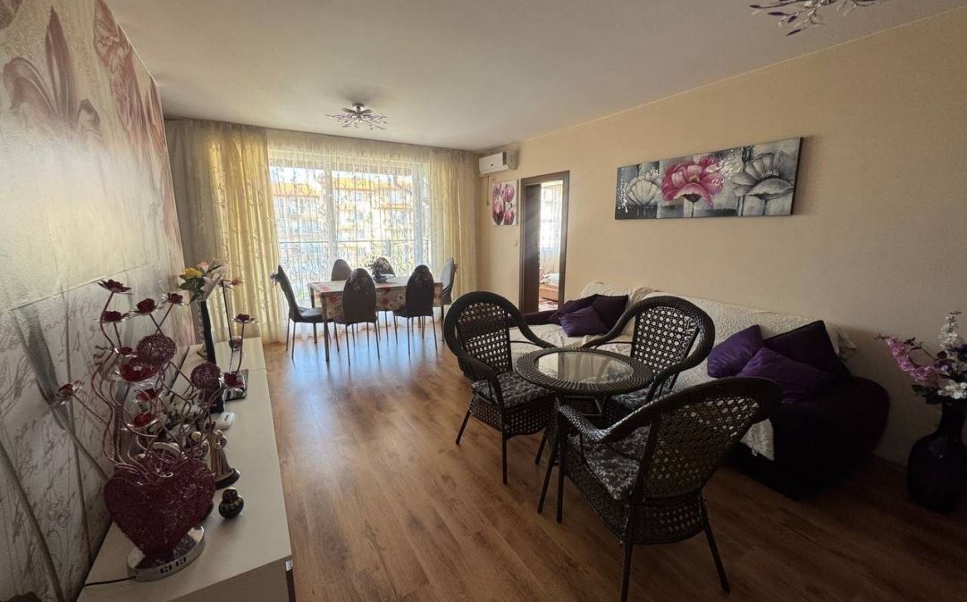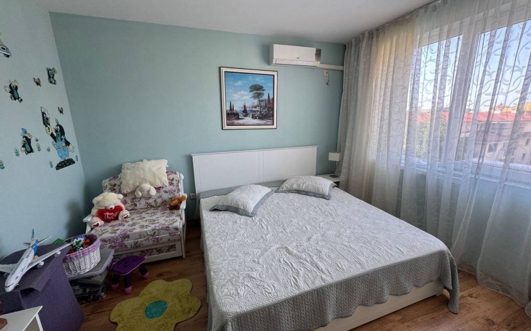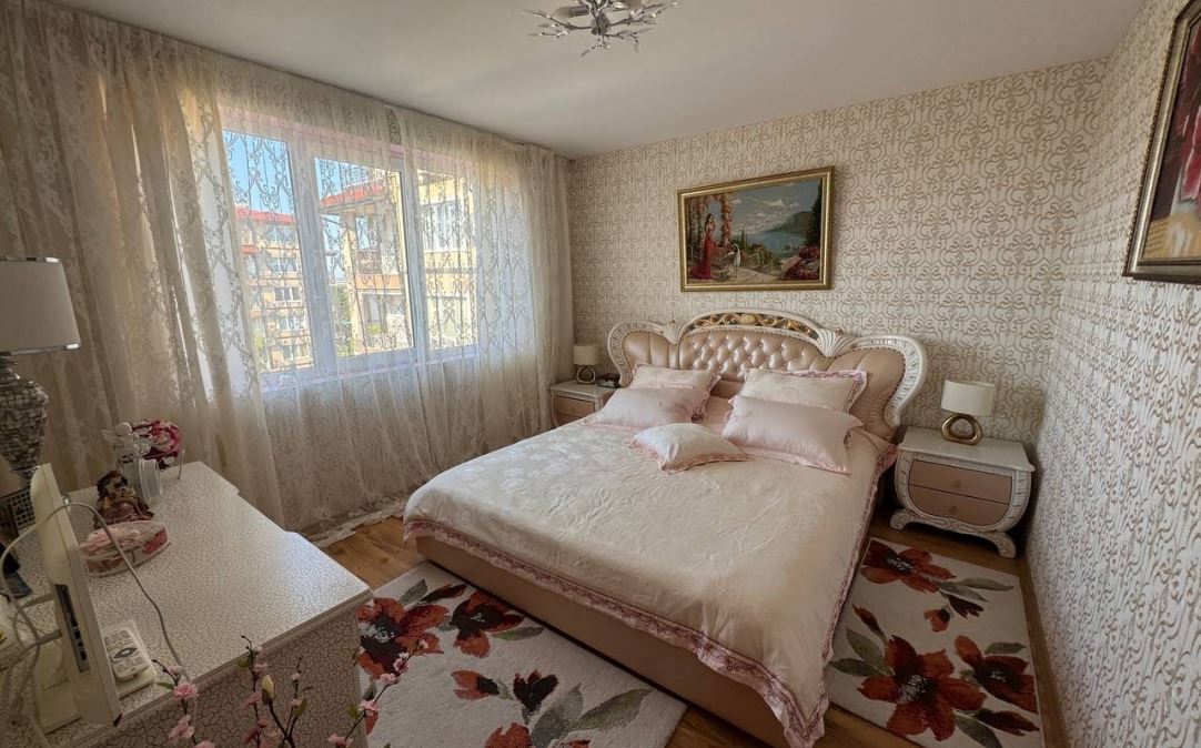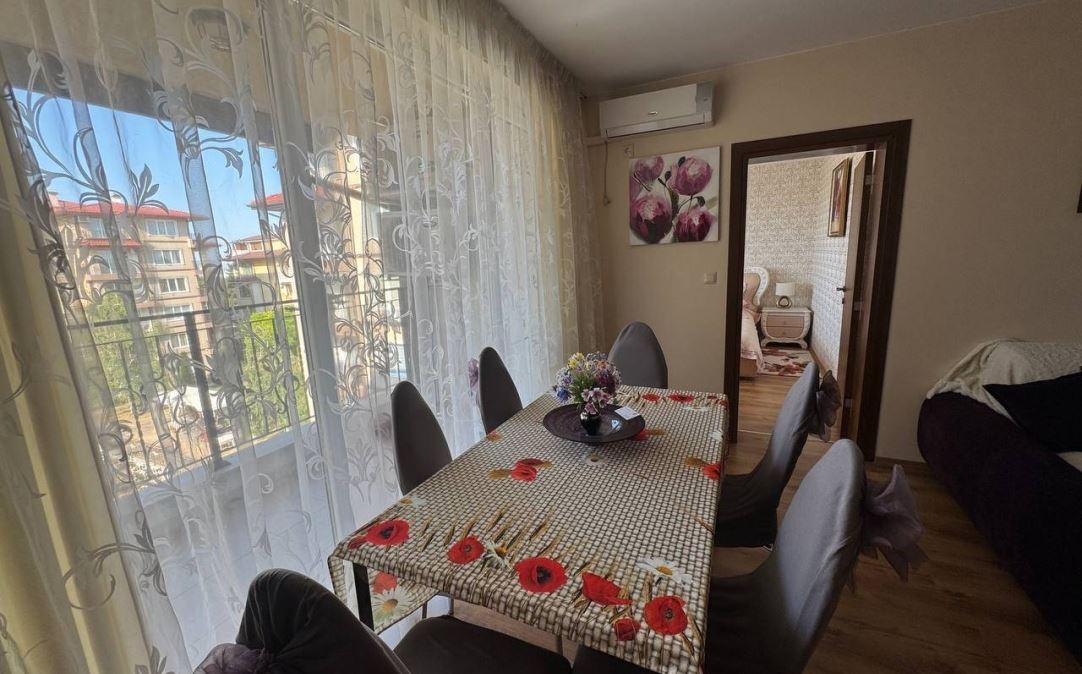 Wir präsentieren Ihnen eine helle und geräumige Wohnung mit zwei Schlafzimmern mit einer Fläche von 100 m², gelegen im ruhigen und beliebten Badeort Ravda. Die Immobilie befindet sich im fünften Stock eines sechsstöckigen Gebäudes mit Act 16, was Sicherheit und einen vollständig geregelten Status garantiert.