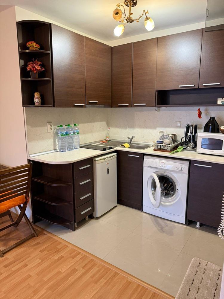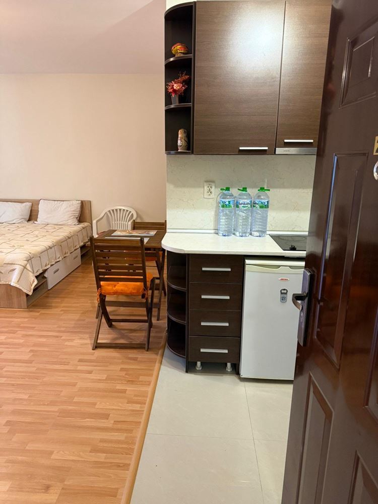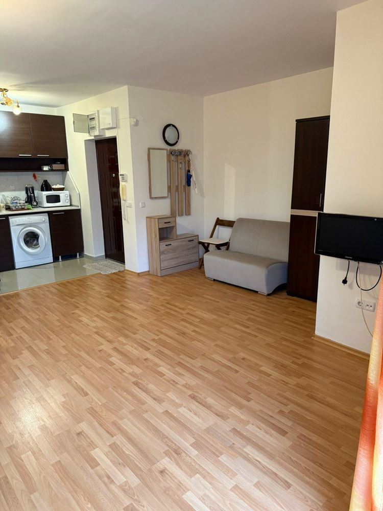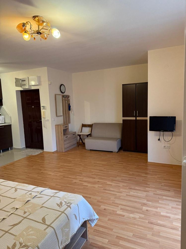Die Wohnung besteht aus einem geräumigen Raum mit Küchenzeile und abgegrenztem Schlafbereich, Bad mit Toilette und Terrasse, die zusätzlichen Raum zur Erholung bietet. Die Wohnung ist vollständig möbliert, was einen sofortigen Einzug oder eine Vermietung ohne zusätzliche Kosten ermöglicht.