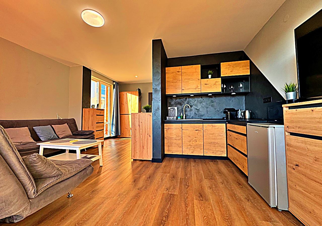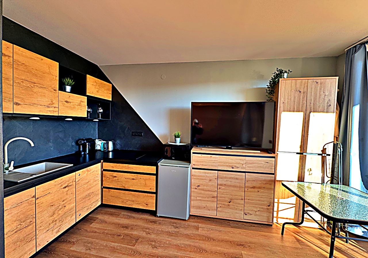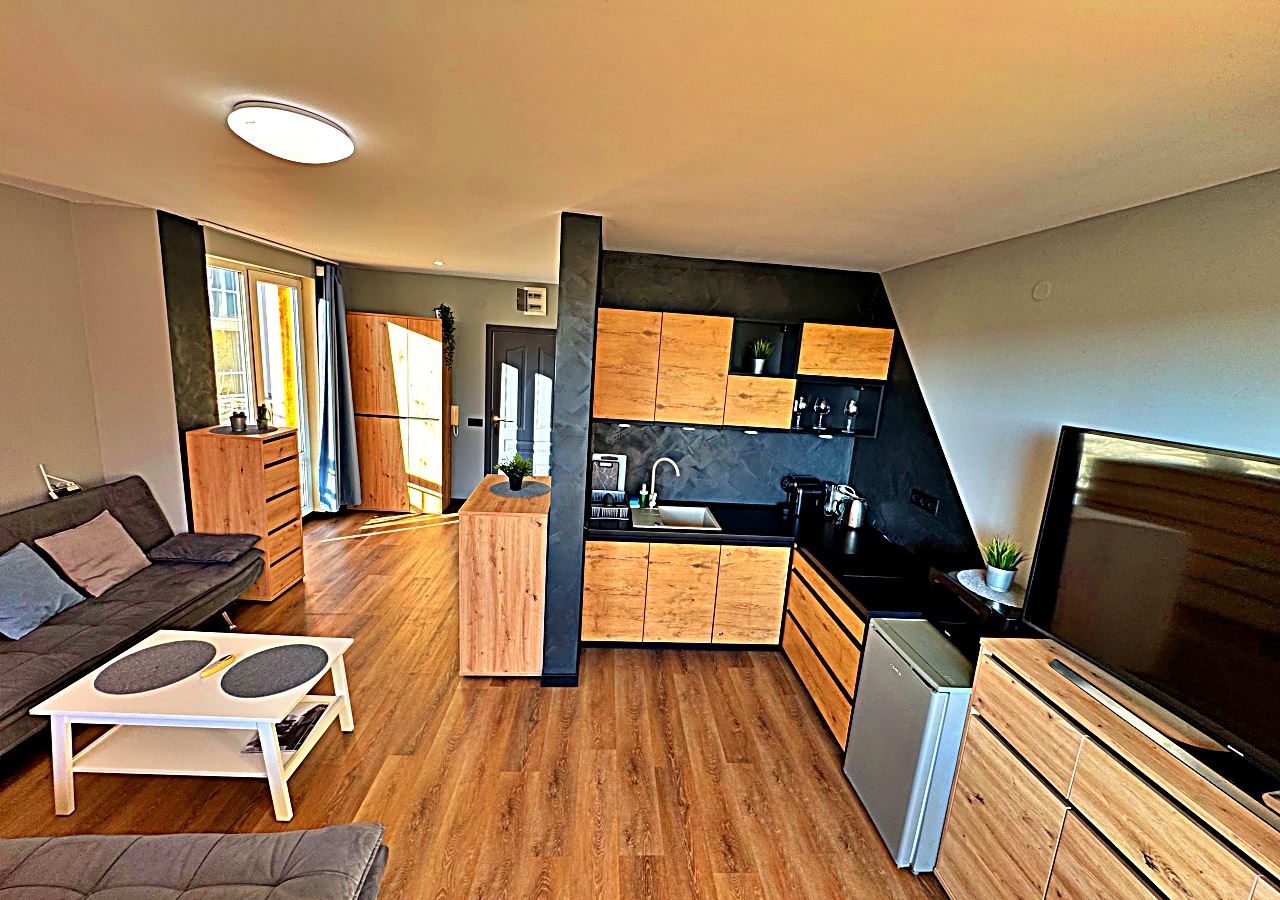 Das Studio ist geräumig, hell und funktional gestaltet und verfügt über einen komfortablen Wohnbereich, eine separate Küchenzeile sowie einen Essbereich. Die Einrichtung wurde mit Fokus auf Komfort und Zweckmäßigkeit ausgewählt und schafft eine angenehme Wohnatmosphäre für das ganze Jahr.