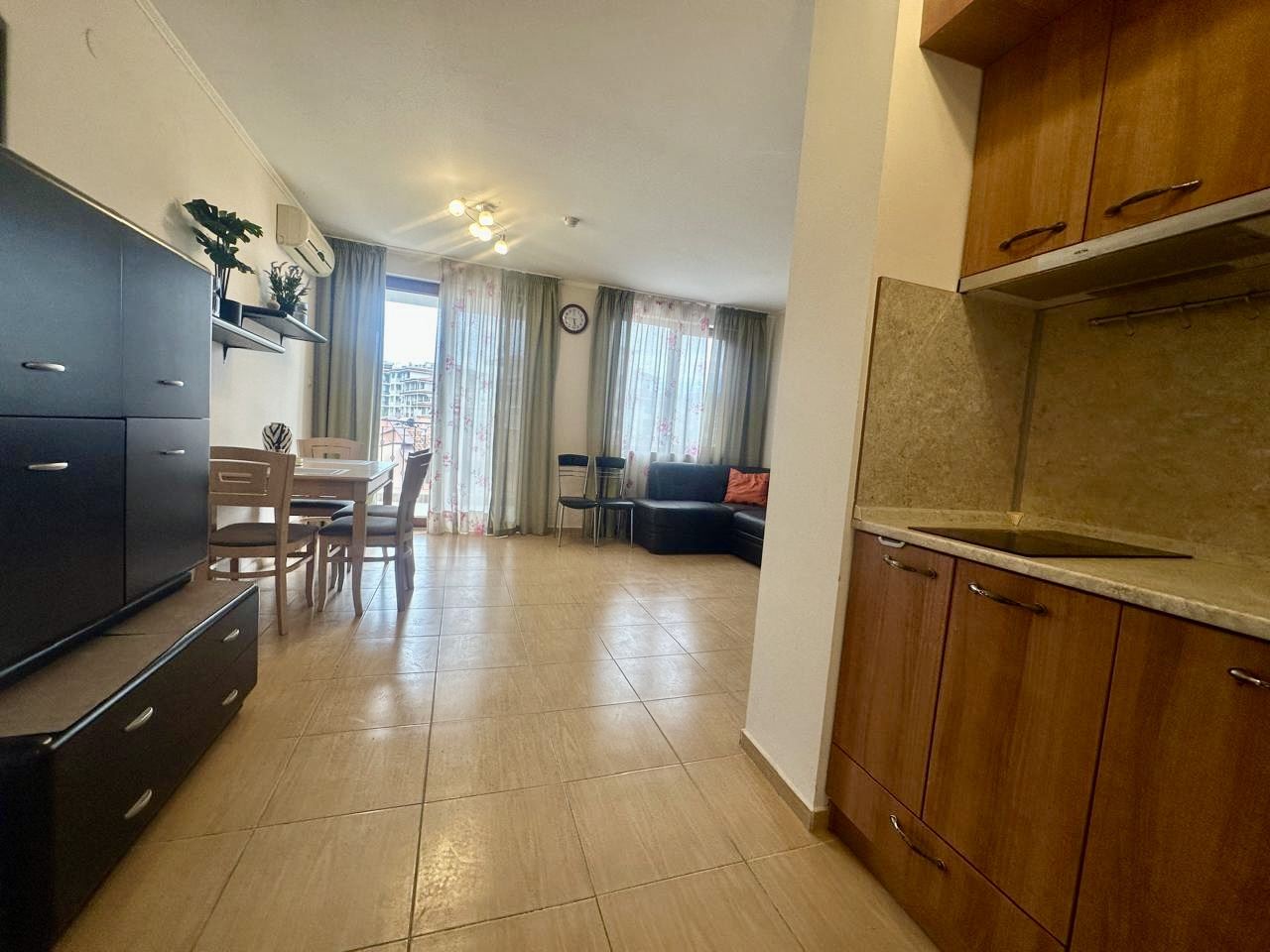 Die Wohnung bietet eine gut organisierte und praktische Raumaufteilung, die die Nutzung jedes Bereichs erleichtert. Das Studio verfügt über einen gemütlichen Essbereich für Mahlzeiten und Familienessen sowie eine komfortable Wohnzone mit Sofa und Fernseher. Die voll ausgestattete Küche bietet alles, was zum Kochen und für den täglichen Gebrauch benötigt wird, während das große Badezimmer mit Toilette Bequemlichkeit und Funktionalität bietet. Die geräumige Terrasse bietet einen schönen Blick auf die Stadt und zusätzliches Tageslicht, wodurch ein Gefühl von Freiheit und Komfort entsteht.