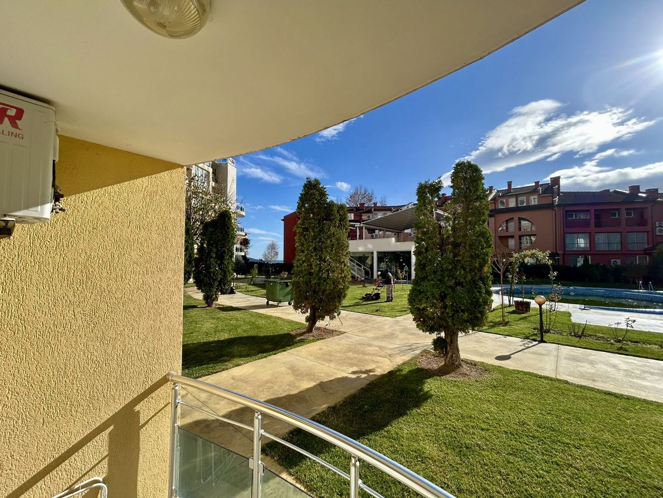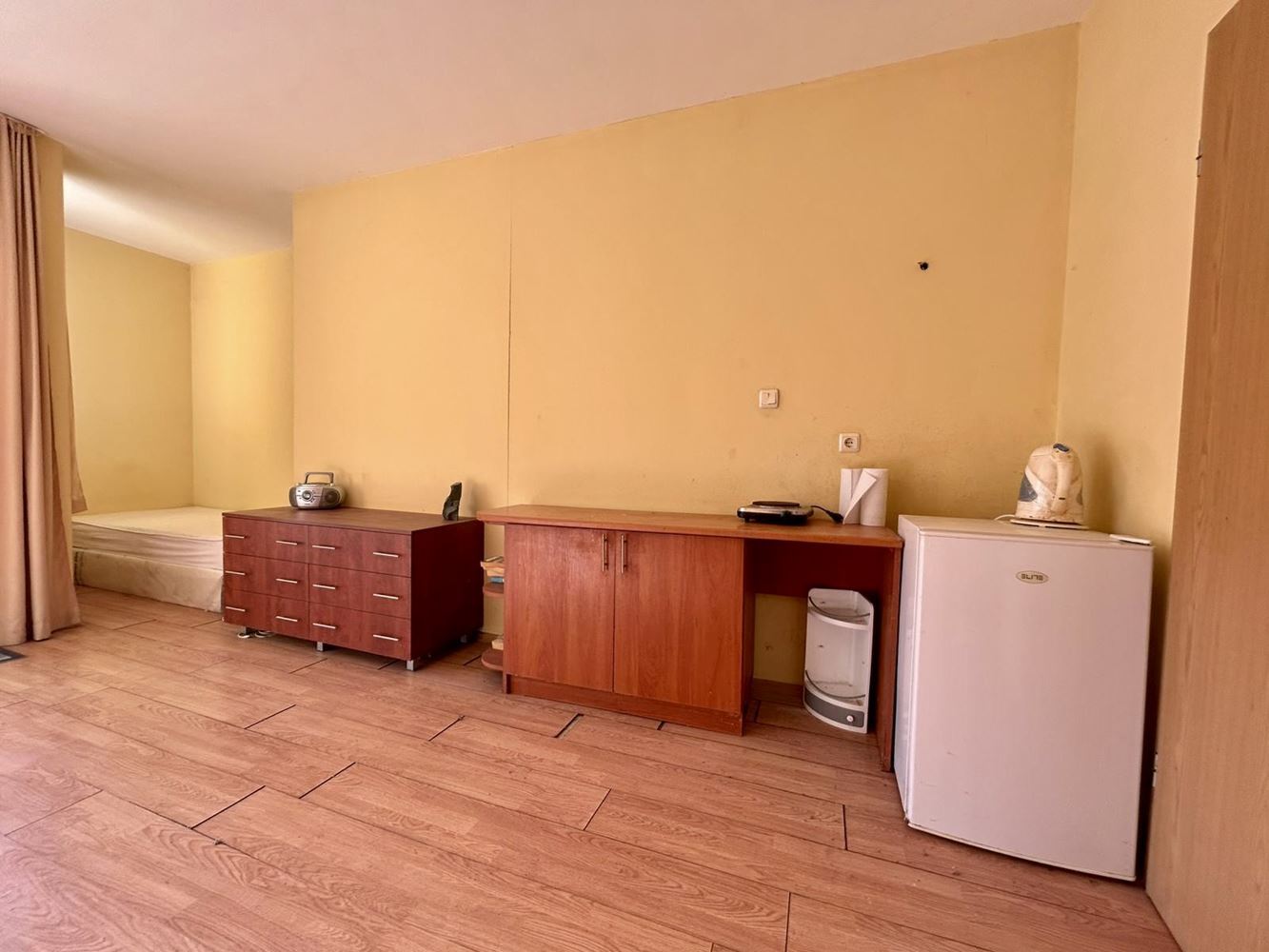 Zum Verkauf steht ein sonniges und geräumiges Studio im Erdgeschoss mit einer Gesamtfläche von 41 m², gelegen in einem gepflegten Gebäude/Komplex in Ravda. Die Wohnung besticht durch große Panoramafenster, die reichlich natürliches Licht und einen schönen Blick auf die Grünflächen, den Pool und teilweise auf das Meer bieten. Die Immobilie ist als offener Raum funktional organisiert, mit abgetrennten Bereichen für Wohnen, Küche und Schlafbereich, und wird mit vorhandenen Möbeln angeboten – bezugsfertig oder sofort zur Vermietung geeignet, ohne zusätzliche Investitionen. Das Badezimmer mit WC ist in ausgezeichnetem Zustand. Highlight ist die großzügige Terrasse, ideal für Morgenkaffee, Entspannung nach dem Strand oder Treffen mit Freunden im Freien.