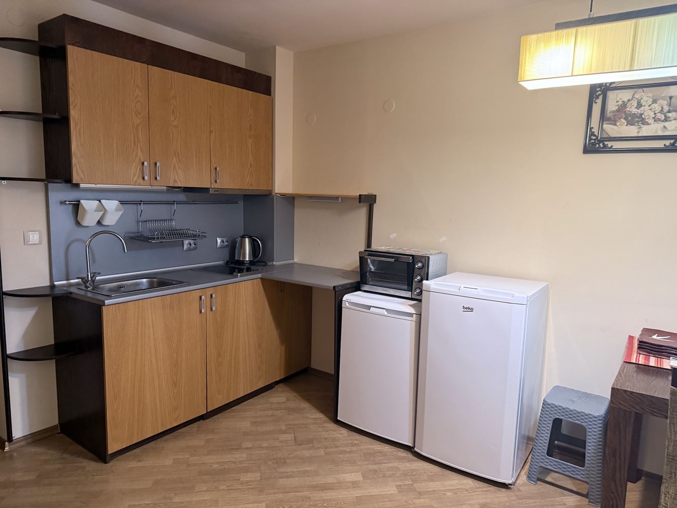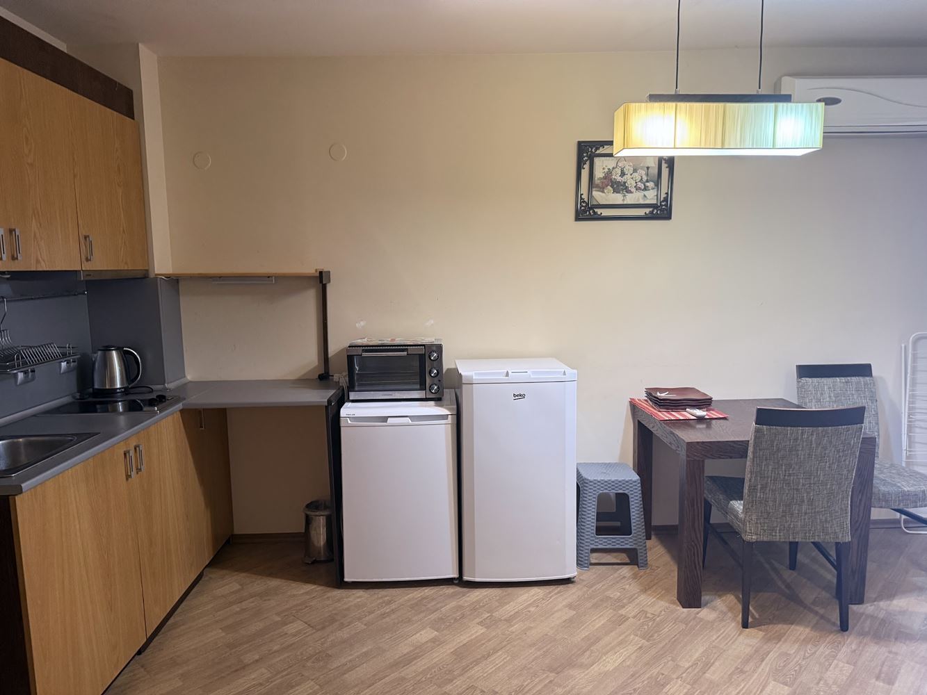 Das Studio besteht aus einem geräumigen Wohnzimmer mit Küchenzeile, das einen praktischen und funktionalen Bereich für Entspannung und Unterhaltung bietet, einem Badezimmer mit Toilette und einer großen Terrasse, auf der Sie Morgenkaffee oder abendliche Entspannung an der frischen Luft genießen können. Die Wohnung ist voll möbliert und ausgestattet, bereit für sofortigen Einzug.