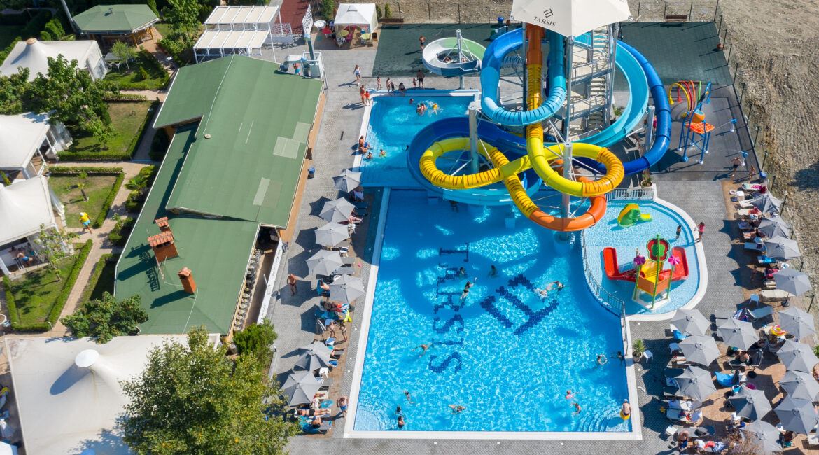 Der Komplex verfügt über zwei große Schwimmbecken für Erwachsene (eins davon 30 Meter lang) und zwei Kinderbecken, die sicheres und unterhaltsames Erlebnis für die Kleinen garantieren. Zusätzlich gibt es einen Spielplatz und Animationsprogramme, sodass Kinder unvergessliche Momente erleben, während die Eltern entspannen. Ein praktischer Parkplatz sorgt für zusätzlichen Komfort.