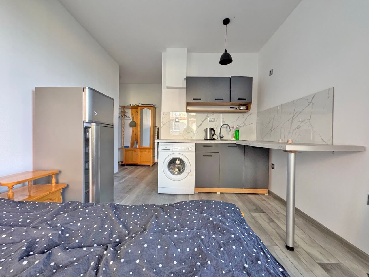 Mit einer Gesamtfläche von 30 m² bietet das Studio einen praktischen Grundriss mit einem offenen Raum, der Platz für Wohn-, Schlaf- und Küchenbereich bietet, sowie ein separates Badezimmer mit WC.
