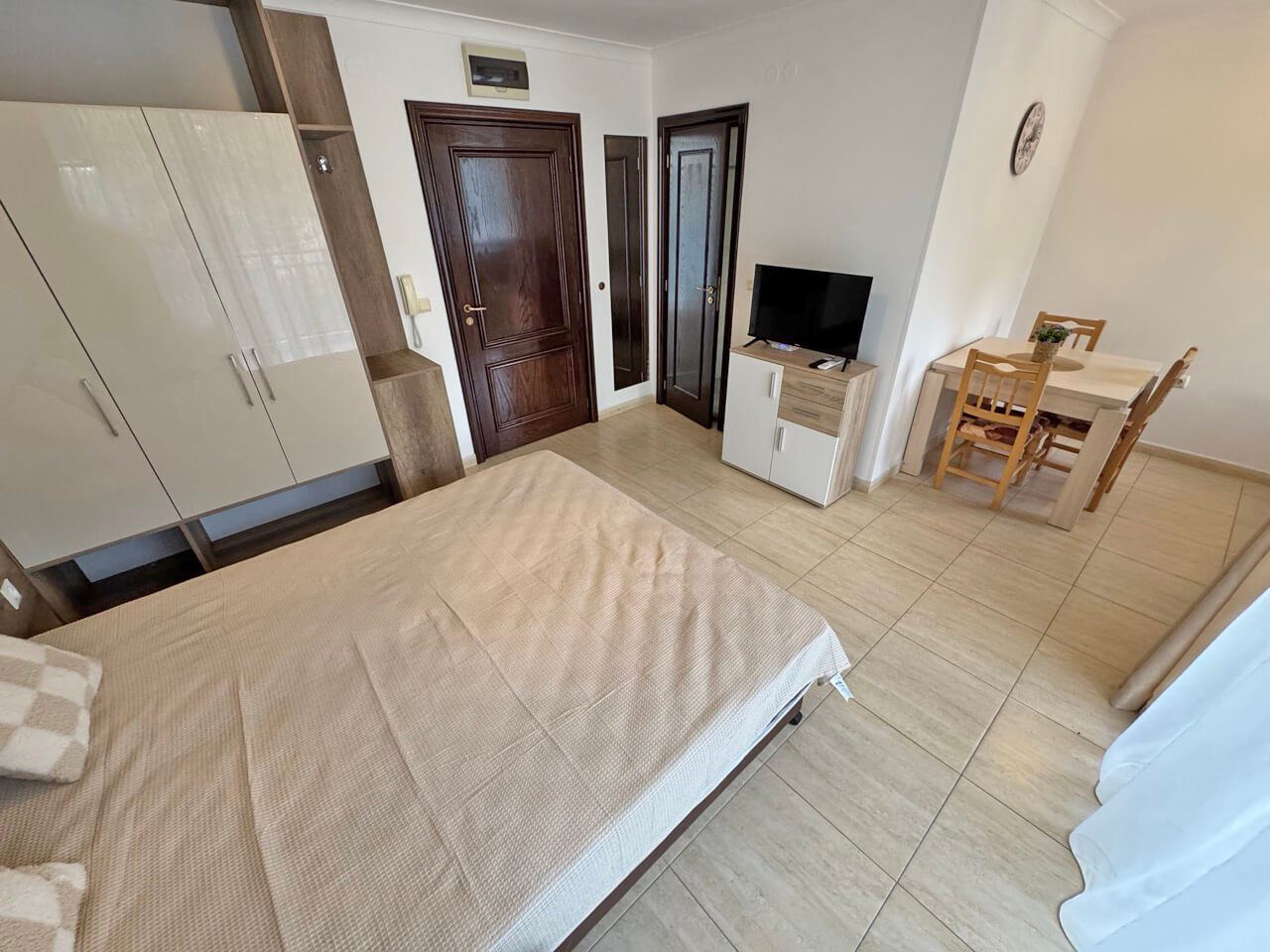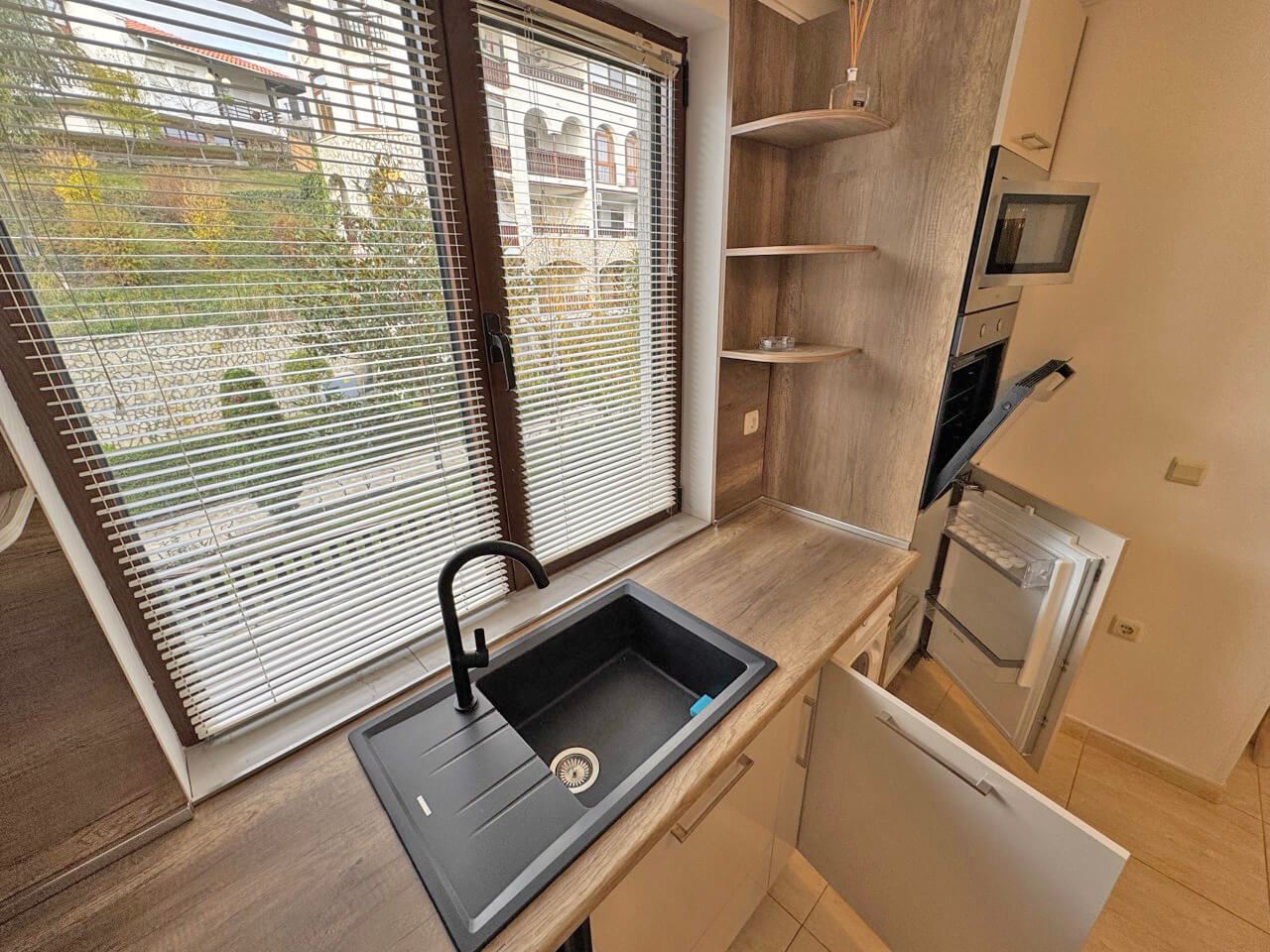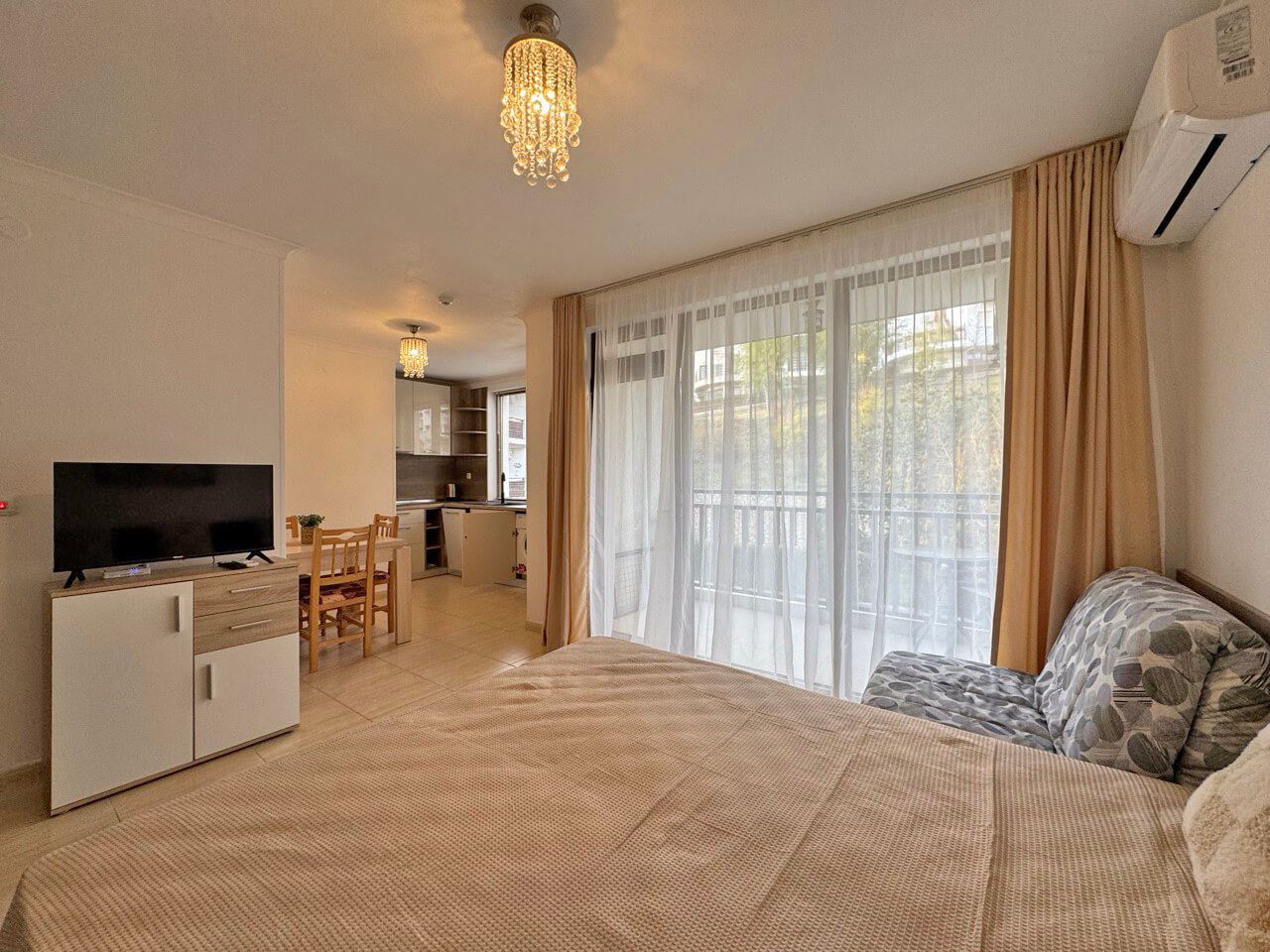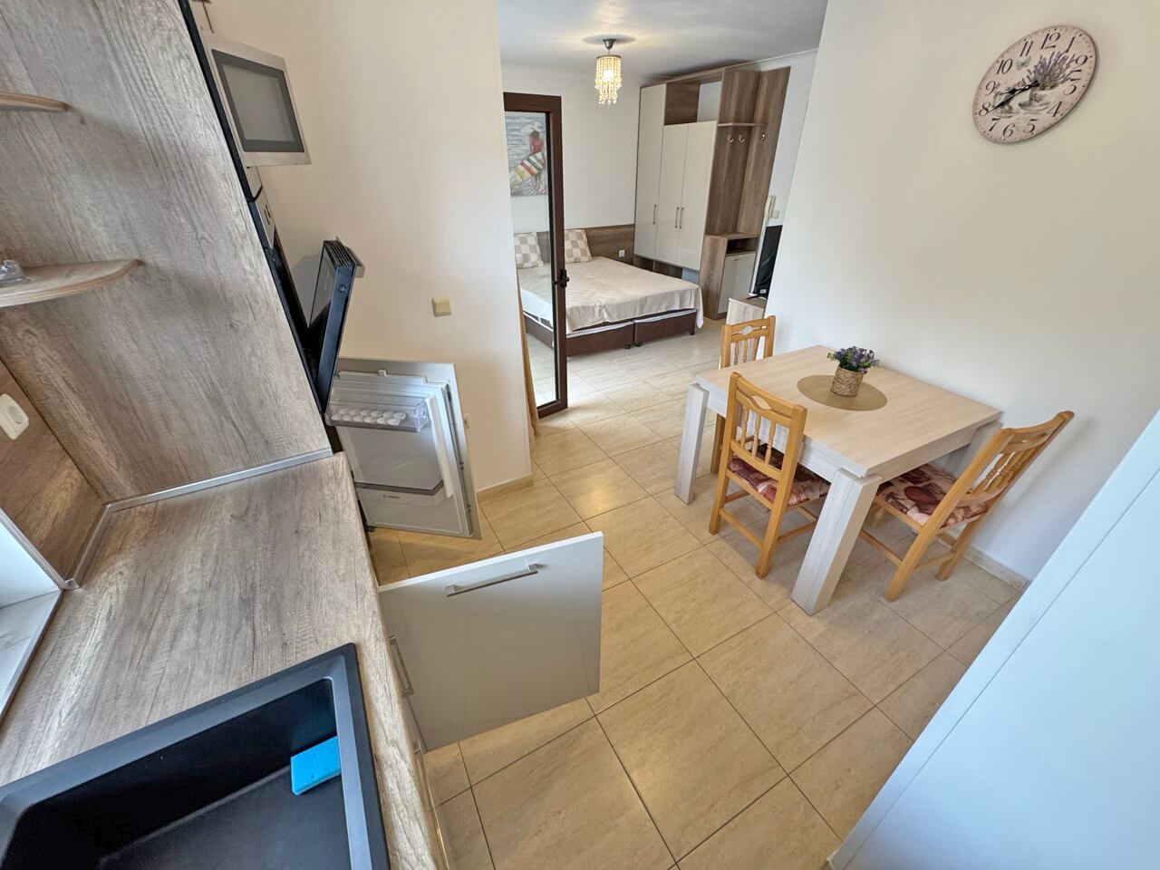 Das Studio wird voll möbliert und ausgestattet verkauft, inklusive Möbeln, Geräten und allem, was für den sofortigen Einzug benötigt wird. Das Interieur ist mit Liebe zum Detail gestaltet und bietet eine gemütliche Atmosphäre, die Funktionalität und Stil vereint. Der Raum ist gut organisiert und ermöglicht komfortables tägliches Leben und entspannte Momente.