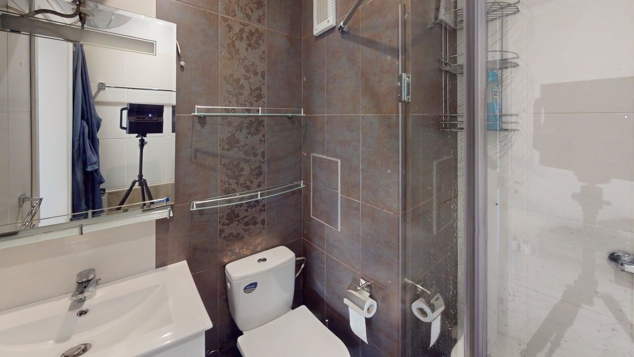 Die Wohnung ist funktional und elegant gestaltet, wobei der Raum harmonisch in eine gemütliche Küche, einen Essbereich sowie einen Ruhe- und Schlafbereich unterteilt ist. Große Fenster sorgen für reichlich Tageslicht und eröffnen einen atemberaubenden Panoramablick auf das Meer, der vom großzügigen Balkon aus in vollen Zügen genossen werden kann – der ideale Ort für den Morgenkaffee oder entspannte Abende mit dem Rauschen der Wellen. Das moderne Badezimmer ist stilvoll und mit viel Liebe zum Detail ausgeführt und unterstreicht das Gefühl von Komfort und Luxus.