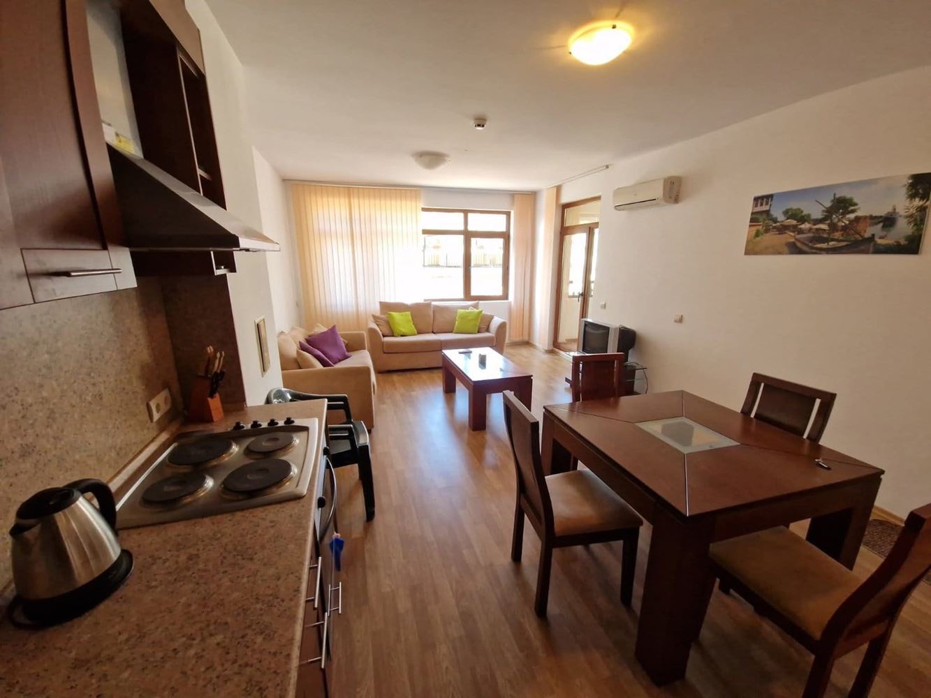 Wir bieten zum Verkauf eine Zweizimmerwohnung mit einer Fläche von 75 m², gelegen im ersten Wohngeschoss über dem Erdgeschoss in einem prestigeträchtigen SPA-Hotel in Aheloy. Die Wohnung beeindruckt durch eine funktionale Aufteilung und eine gemütliche Atmosphäre, die für komfortables Wohnen oder einen vollwertigen Urlaub geschaffen wurde. Die Wohnung verfügt über ein geräumiges Wohnzimmer mit Kochnische, ein Schlafzimmer, ein Badezimmer mit Toilette und eine große Terrasse, die eine natürliche Erweiterung des Wohnraums darstellt – ein idealer Ort für Morgenkaffee, Abendgespräche oder Entspannung mit Blick auf Grün und Ruhe. Die Terrasse ist ein wesentlicher Akzent der Immobilie und bietet zusätzlichen Wert sowohl für den Eigenbedarf als auch für die Vermietung.