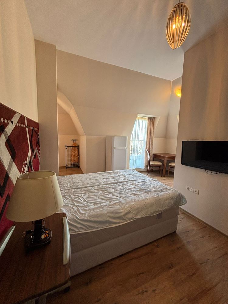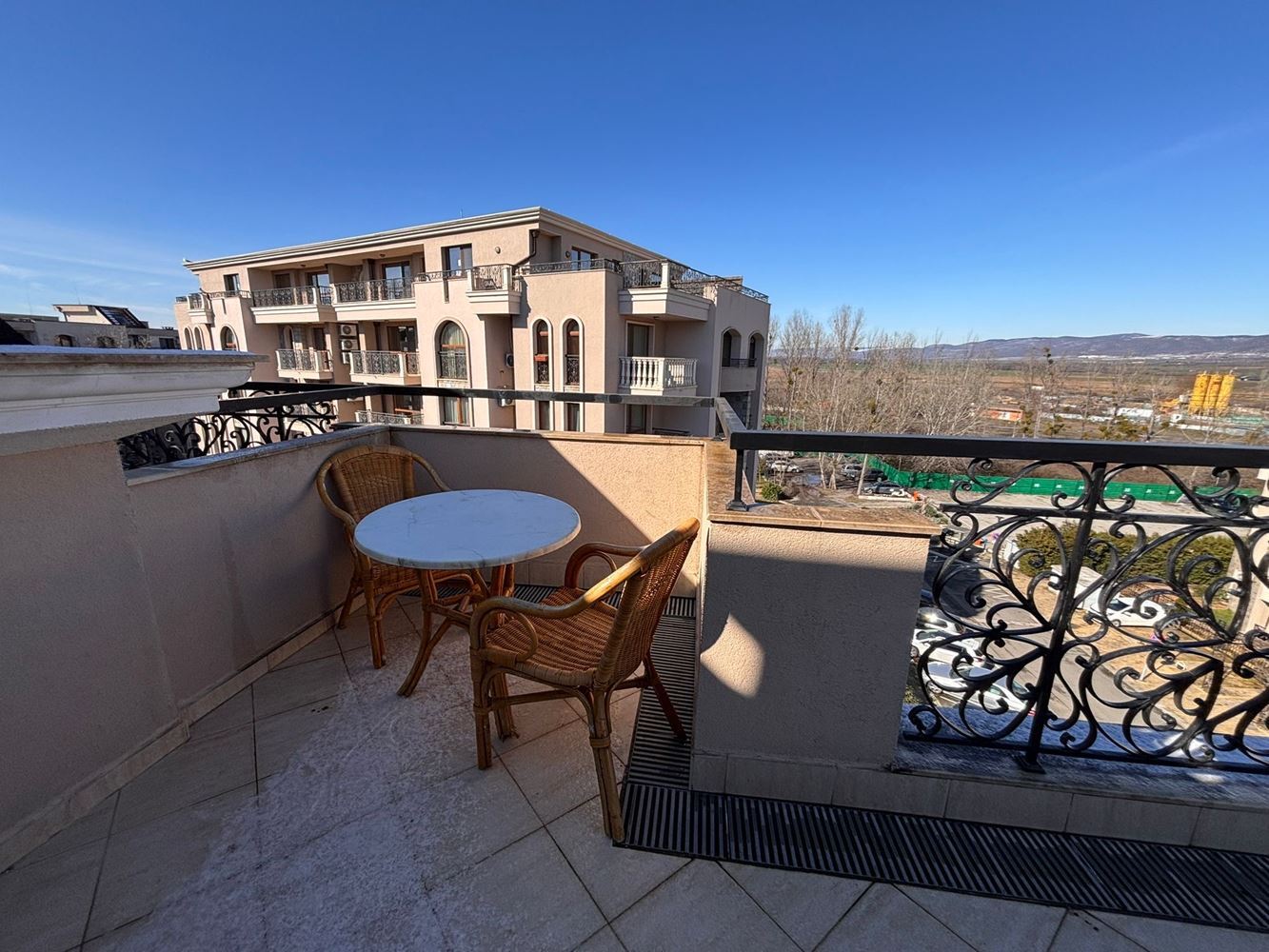 Wir bieten ein vollständig möbliertes und ausgestattetes Studio mit einer großzügigen Panoramaterrasse zum Verkauf an, gelegen im fünften Stock eines luxuriösen Komplexes im ruhigen und friedlichen Teil von Sonnenstrand. Die Immobilie hat eine Gesamtfläche von 52,05 m² und bietet eine ideale Balance zwischen Komfort, Funktionalität und Urlaubsatmosphäre, was sie zu einer ausgezeichneten Wahl sowohl für den Eigenbedarf als auch als Investition mit Vermietungspotenzial macht. Das Interieur ist mit Liebe zum Detail gestaltet und umfasst einen hellen Wohnbereich mit Kochnische, Schlafbereich und Essplatz, die ein Gefühl von Geräumigkeit und Gemütlichkeit schaffen. Die Wohnung wird vollständig möbliert und ausgestattet verkauft, bereit für den sofortigen Einzug ohne zusätzliche Investitionen. Ein echtes Highlight ist die Panoramaterrasse, die einen angenehmen Raum für Entspannung, Morgenkaffee oder abendliche Erholung mit Blick auf die Umgebung bietet.