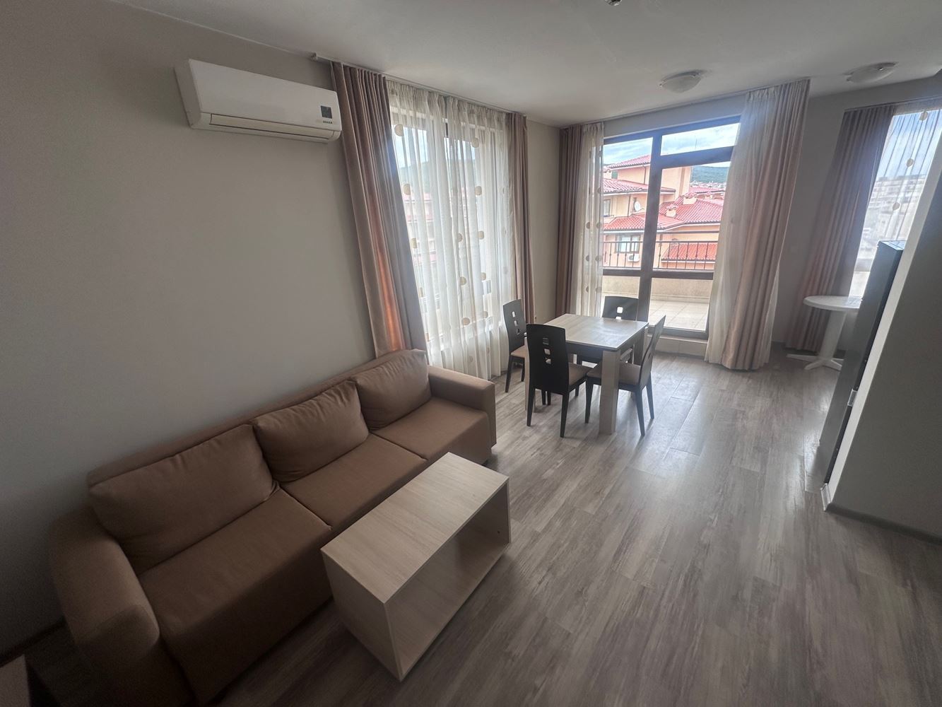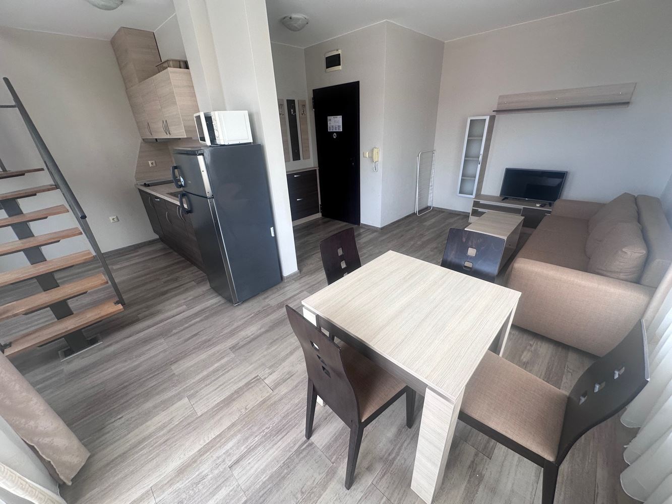 Lernen Sie dieses außergewöhnliche Maisonette-Apartment in der wunderschönen Stadt Sveti Vlas kennen – der perfekte Ort für Ihr neues Zuhause oder Ihren Urlaub. Mit einer Fläche von 99,76 m² bietet diese Immobilie Komfort und Stil, verbunden mit beeindruckenden Ausblicken auf das Meer und die Berge, die Sie begeistern werden. Das Maisonette verfügt über 2 großzügige Zimmer, darunter ein gemütliches Schlafzimmer, und vereint Funktionalität mit Eleganz. Genießen Sie Ihren Morgenkaffee auf einem der beiden Balkone und atmen Sie die frische Meeresbrise sowie die malerische Panoramaansicht ein. Das Badezimmer ist modern ausgestattet und bietet allen Komfort, den Sie benötigen.