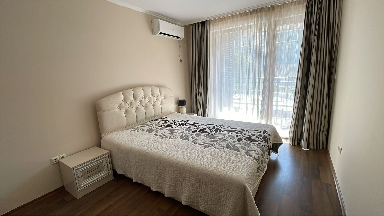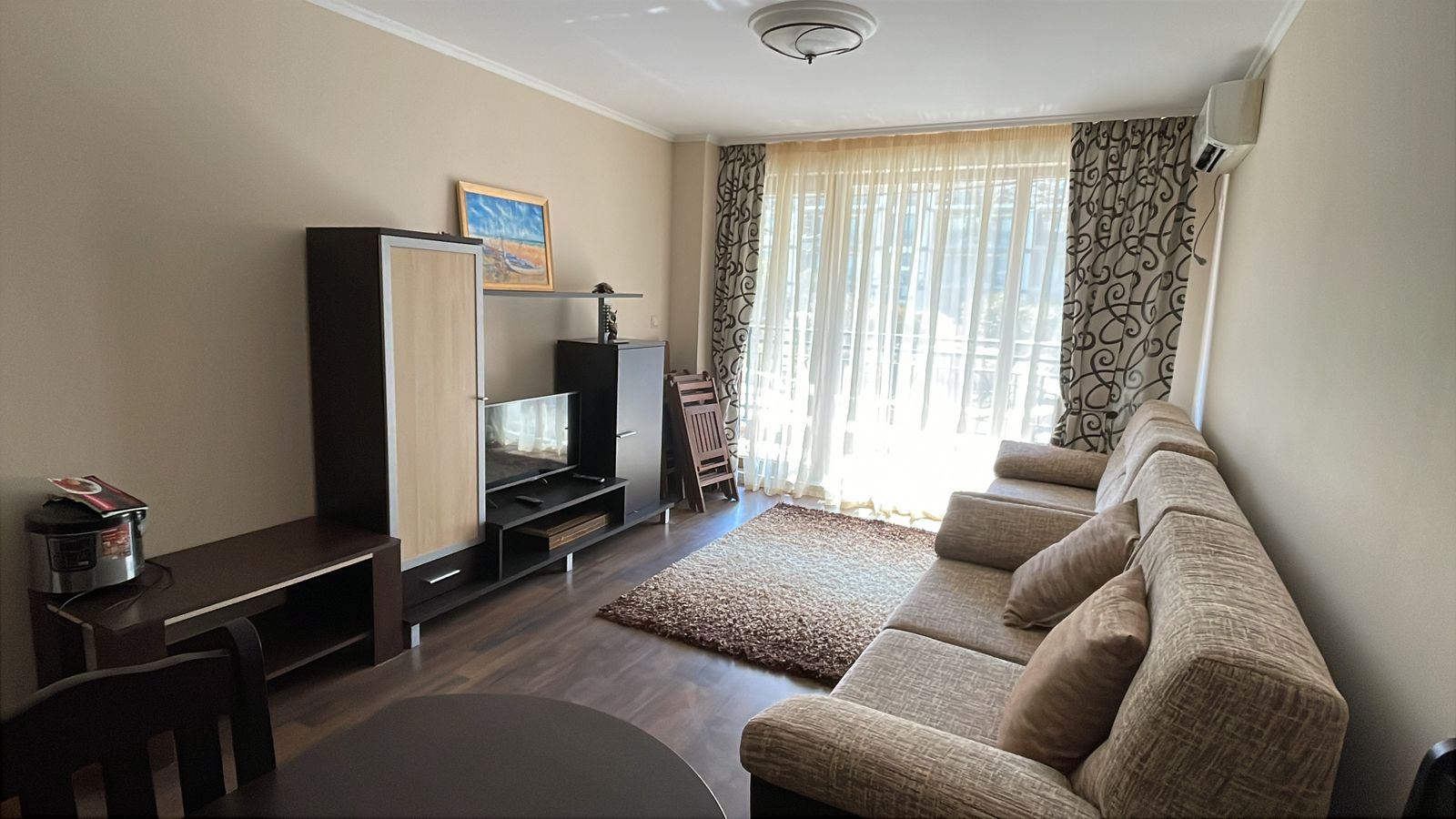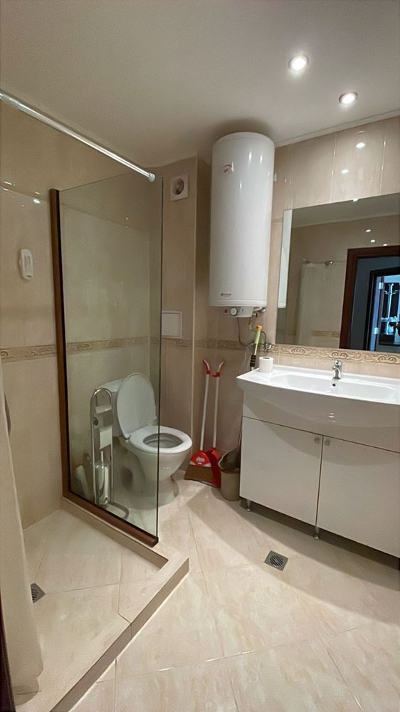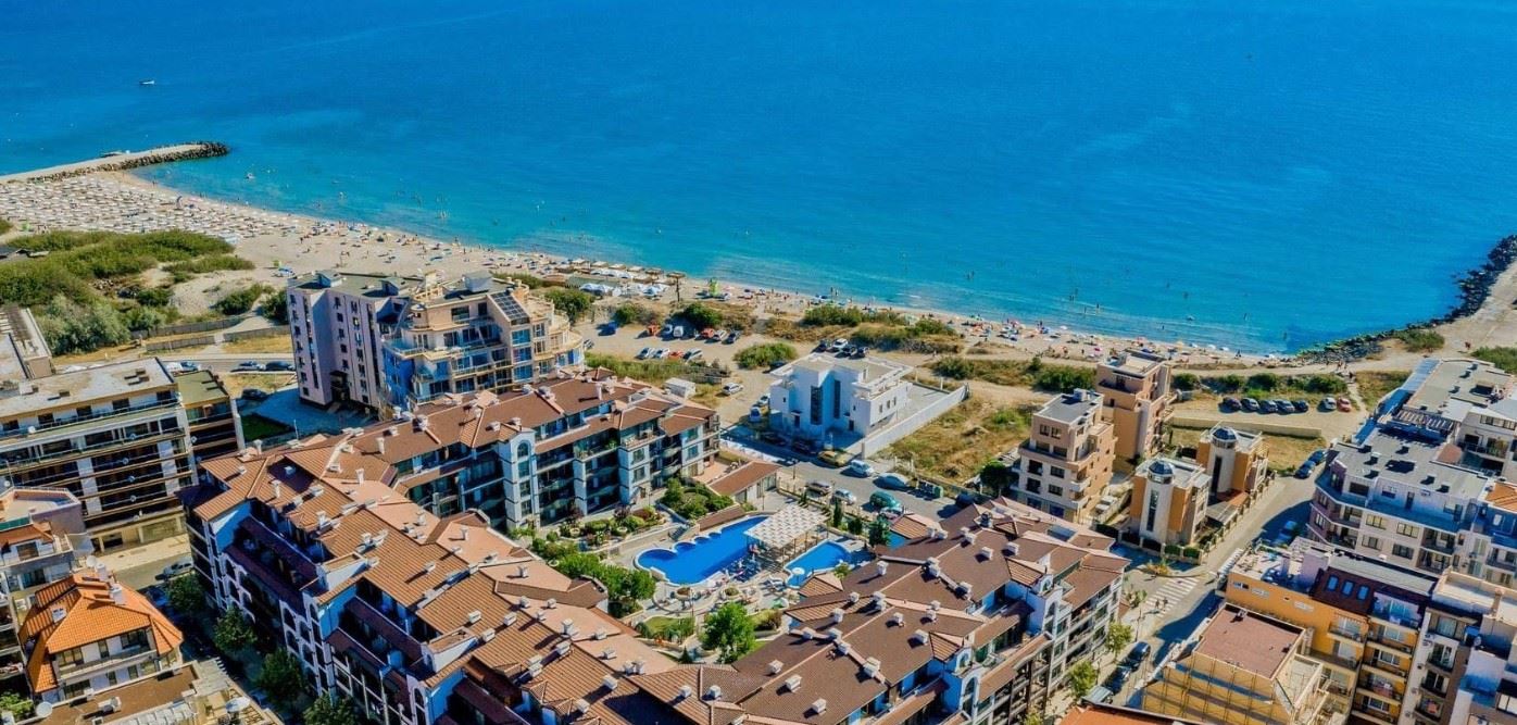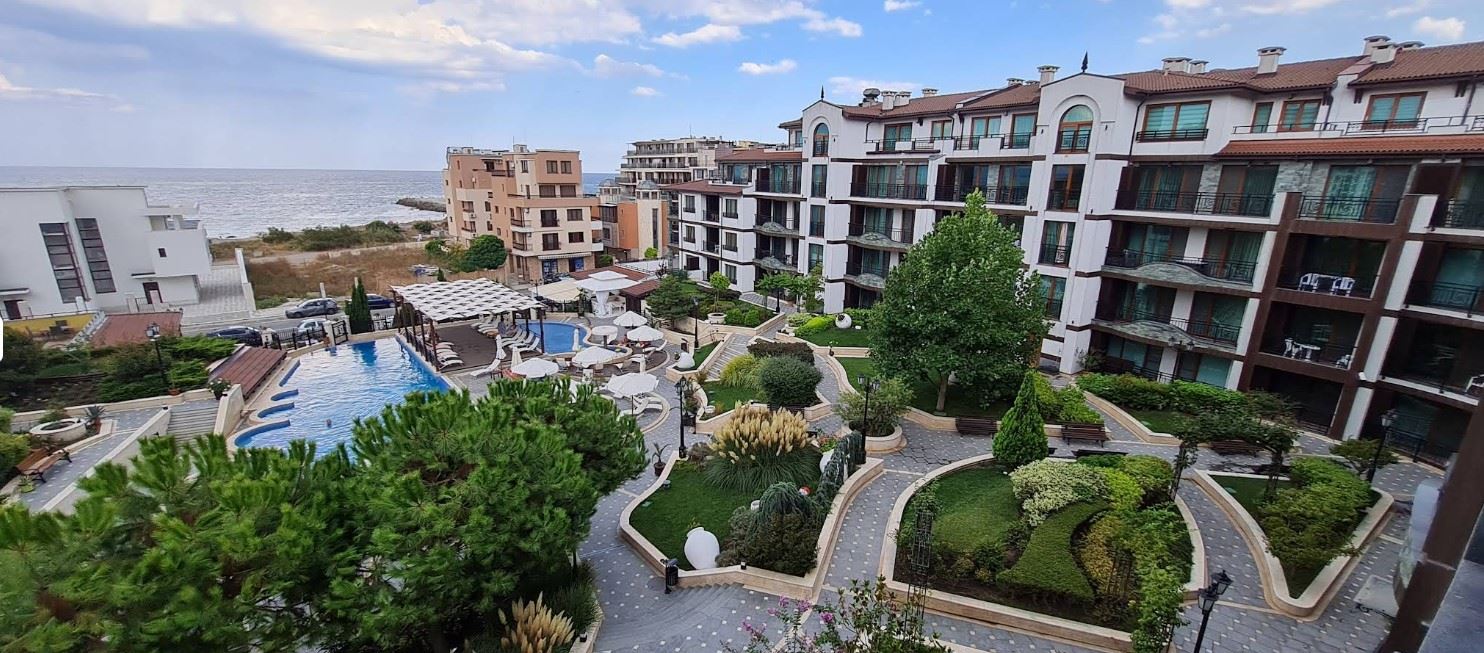 Wir präsentieren eine gemütliche und vollständig möblierte Ein-Zimmer-Wohnung mit einer Fläche von 62 m², gelegen im Erdgeschoss eines modernen Komplexes, nur 50 Meter vom Meer in der Stadt Pomorie entfernt. Die Immobilie vereint Komfort, ausgezeichnete Lage und einen angenehmen Blick auf den Innenhof und den Pool, was sie zu einer idealen Wahl sowohl für den Eigengebrauch als auch für Investitionen macht. Die Wohnung verfügt über eine funktionale und gut organisierte Aufteilung, bestehend aus einem geräumigen Flur, einem hellen Wohnzimmer mit Küchenbereich, einem gemütlichen Schlafzimmer, einem Badezimmer mit Toilette und einer großen Terrasse. Die Terrasse ist einer der größten Vorteile der Immobilie – sie bietet einen angenehmen Blick auf den schön angelegten Innenhof und den Pool und schafft eine ideale Atmosphäre für Entspannung, Morgenkaffee oder ruhige Abende im Freien.