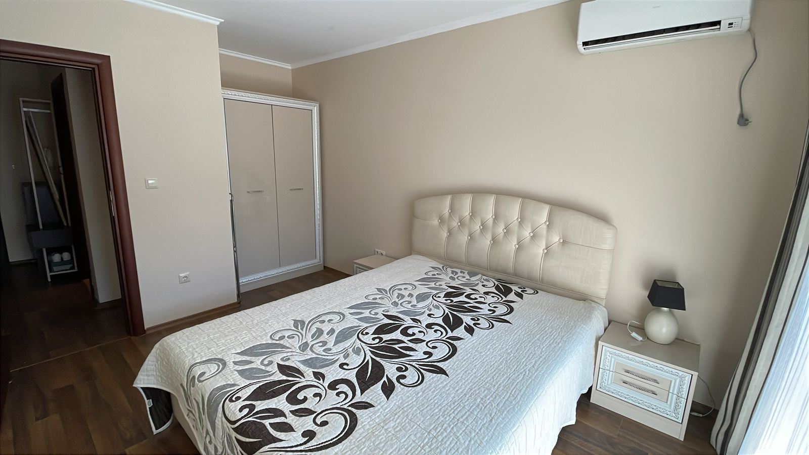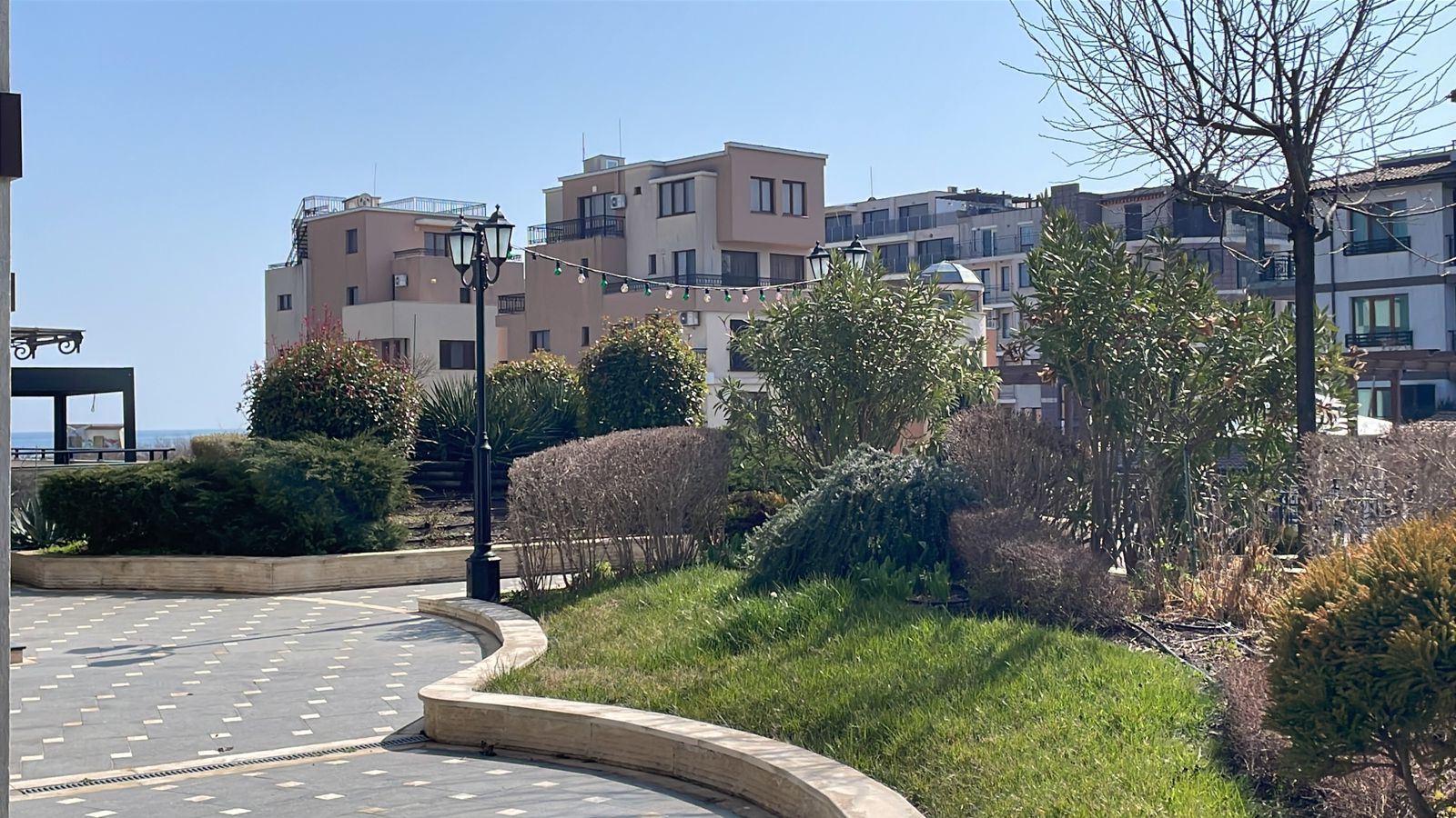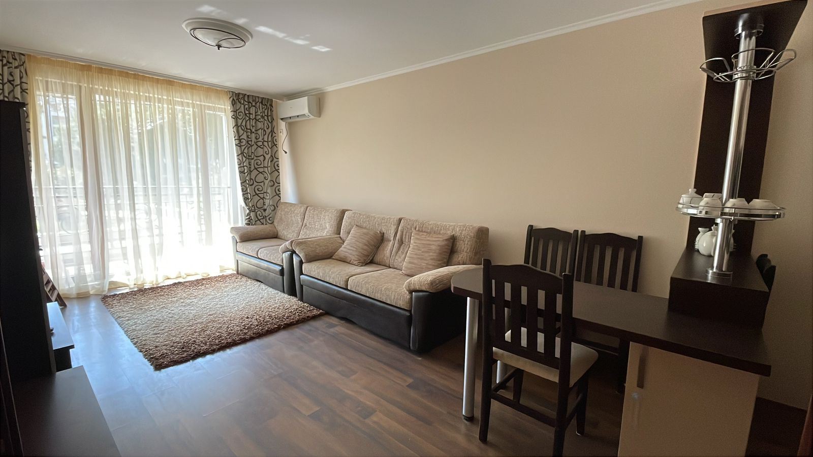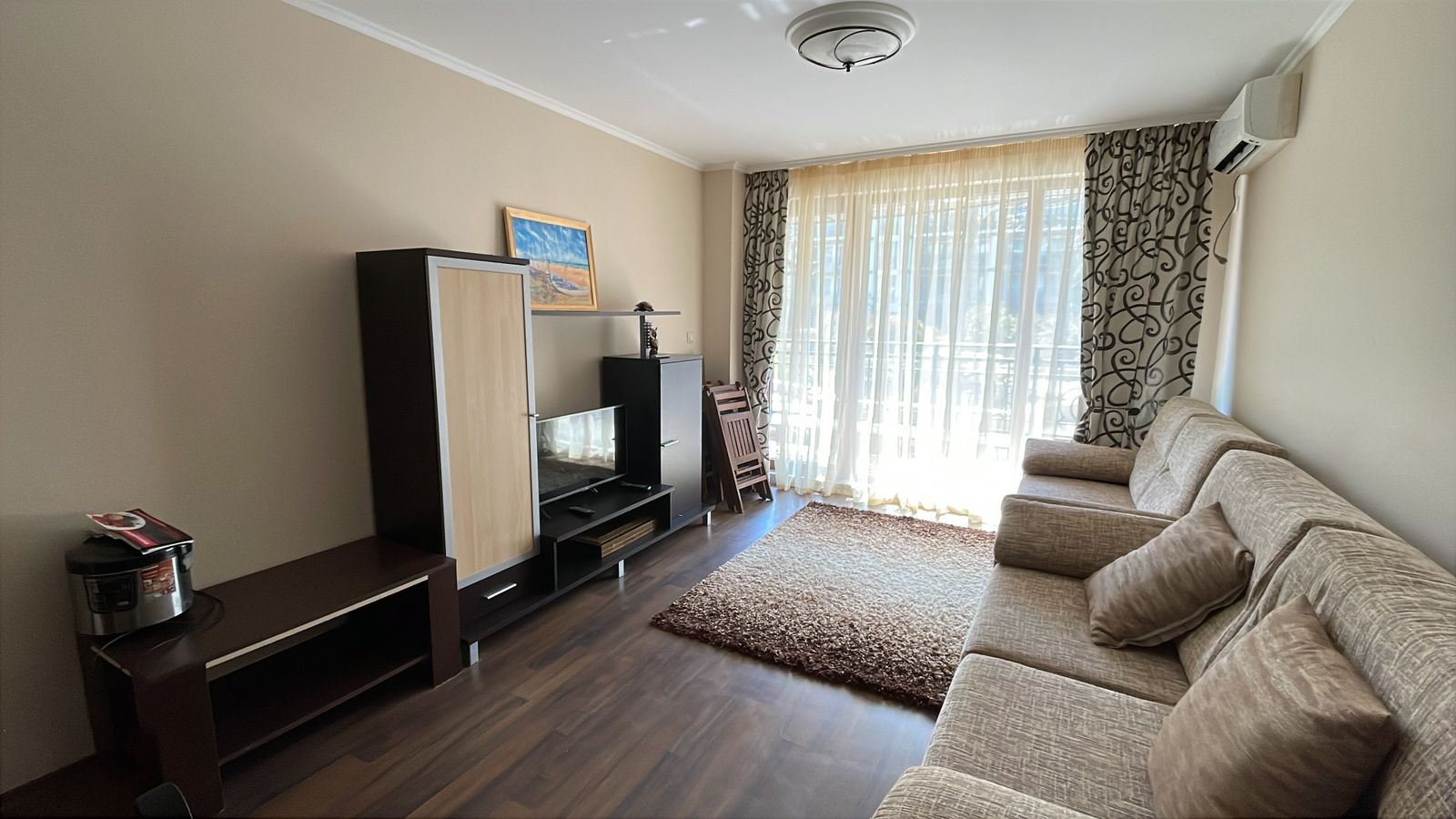 Wir präsentieren eine gemütliche und vollständig möblierte Ein-Zimmer-Wohnung mit einer Fläche von 62 m², gelegen im Erdgeschoss eines modernen Komplexes, nur 50 Meter vom Meer in der Stadt Pomorie entfernt. Die Immobilie vereint Komfort, ausgezeichnete Lage und einen angenehmen Blick auf den Innenhof und den Pool, was sie zu einer idealen Wahl sowohl für den Eigengebrauch als auch für Investitionen macht. Die Wohnung verfügt über eine funktionale und gut organisierte Aufteilung, bestehend aus einem geräumigen Flur, einem hellen Wohnzimmer mit Küchenbereich, einem gemütlichen Schlafzimmer, einem Badezimmer mit Toilette und einer großen Terrasse. Die Terrasse ist einer der größten Vorteile der Immobilie – sie bietet einen angenehmen Blick auf den schön angelegten Innenhof und den Pool und schafft eine ideale Atmosphäre für Entspannung, Morgenkaffee oder ruhige Abende im Freien.