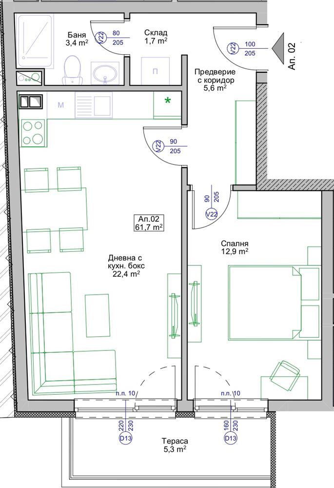 Die Wohnung besticht durch eine funktionale und praktische Aufteilung: Eingang/Halle, geräumiges Wohnzimmer mit Küchenbereich, separates Schlafzimmer, Bad mit WC, Abstellraum und eine Terrasse – ideal für den Morgenkaffee oder die Abendentspannung. Die kompakte, logische Raumaufteilung vermittelt ein großzügiges Raumgefühl und erleichtert die Inneneinrichtung. Die Wohnung wird nach bulgarischen Bauvorschriften (BDS) übergeben, mit hoher Detailgenauigkeit und hochwertigen Materialien, sodass die neuen Eigentümer ihr persönliches Design und Mobiliar realisieren können. Das Gebäude verfügt über moderne Architektur, repräsentative Gemeinschaftsbereiche und einen Aufzug für täglichen Komfort.