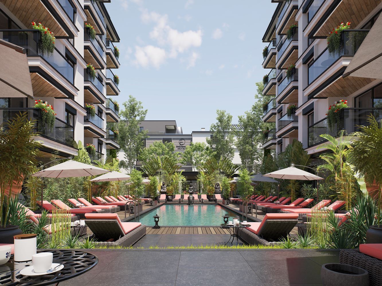 Die Wohnung hat eine Gesamtfläche von 61 m², befindet sich im zweiten Stock, ist nach Osten ausgerichtet und bietet einen schönen Blick auf den Pool der Anlage. Die Aufteilung ist praktisch: ein geräumiges Wohnzimmer mit Platz für Küchenzeile und Essbereich, ein separates Schlafzimmer, ein Bad/WC und ein sonniger Balkon – ideal für den Morgenkaffee. Das Gebäude verfügt über einen Aufzug für täglichen Komfort.
