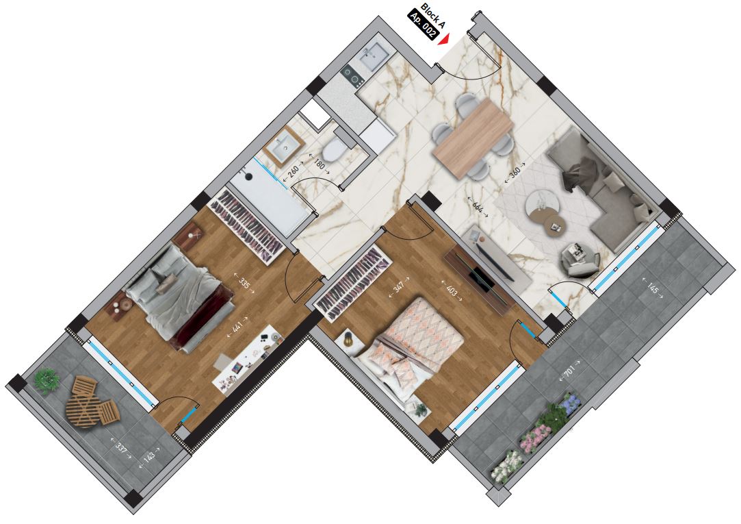 Das architektonische Konzept verbindet elegantes europäisches Design mit zeitgenössischen Trends, was dem Komplex ein modernes, aber zeitloses Aussehen verleiht. Im Innenbereich wurden natürliche Materialien wie Stein, Holz und Schmiedeeisen verwendet, die ein Gefühl von Stil, Beständigkeit und Eleganz schaffen. Panoramafenster und großzügige Terrassen sorgen für viel Tageslicht und verstärken das Gefühl von Raum und Harmonie mit der Umgebung.