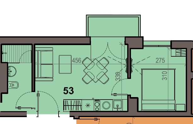 Die Wohnung befindet sich im fünften Stock und bietet einen herrlichen Meerblick. Mit einer Gesamtfläche von 43,52 m² ist der Grundriss funktional: Wohnzimmer mit Platz für eine Küchenzeile, ein separates Schlafzimmer, Badezimmer mit WC und ein kleiner Balkon – perfekt für den Morgenkaffee mit Blick auf das blaue Meer. Die Südwest-Ausrichtung sorgt für viel Tageslicht und angenehmen Komfort am Nachmittag.