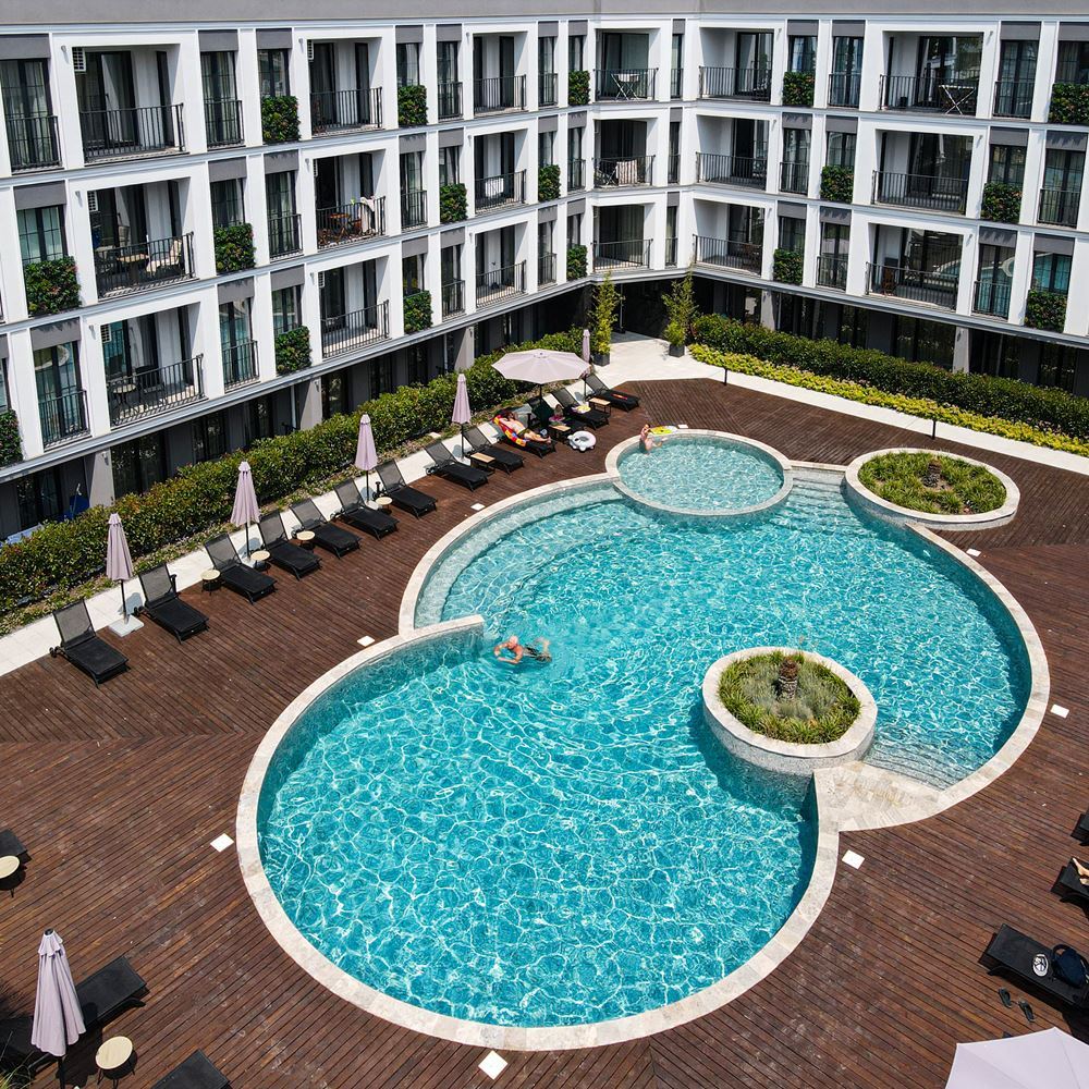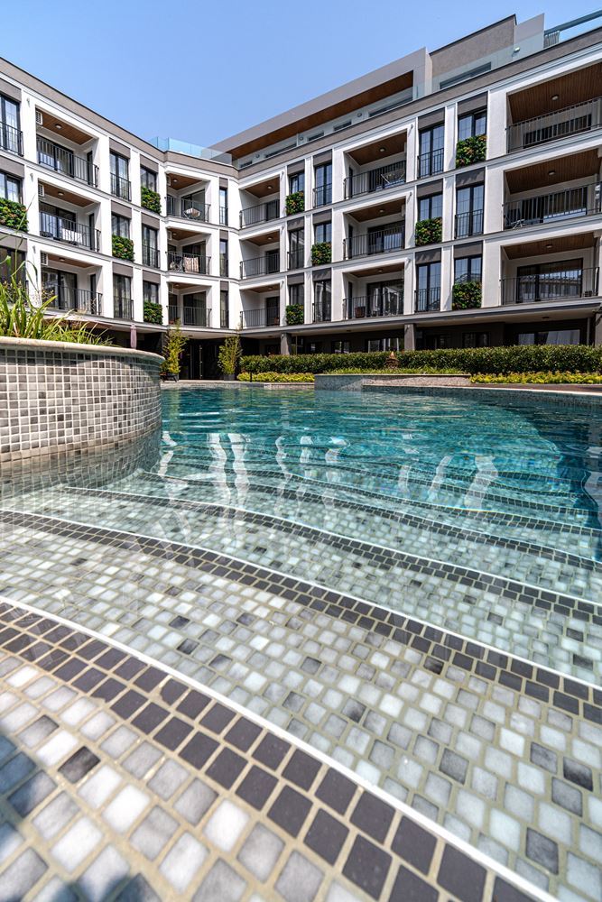 Die Anlage besticht durch elegante Architektur und modernes Design – stilvolle Fassaden, große Fenster, natürliche Materialien und sorgfältig ausgewählte Details schaffen ein Gefühl von Qualität und Komfort. Die Umgebung ist harmonisch und sehr gepflegt.