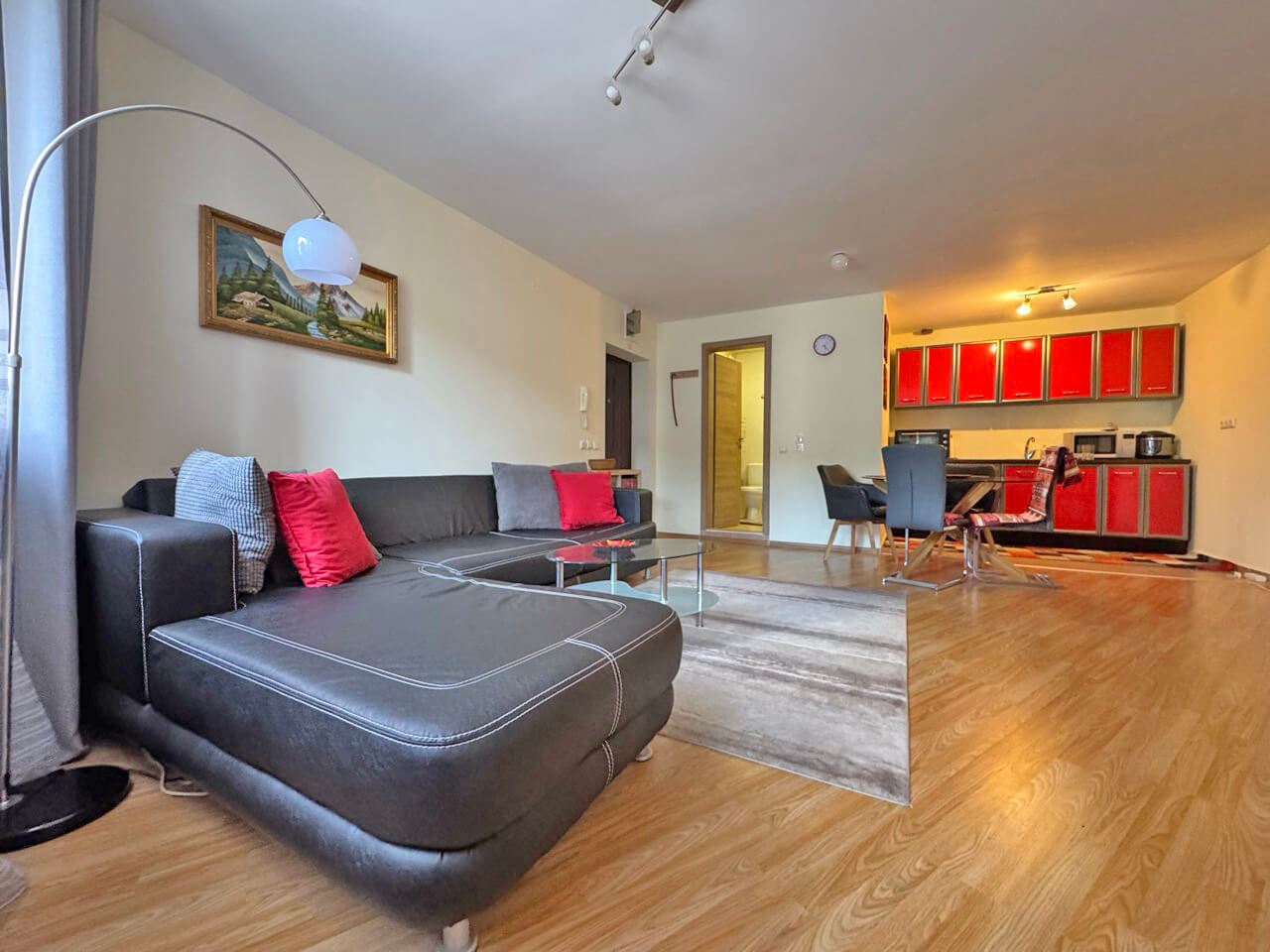 Die Wohnung besteht aus zwei hellen und großzügigen Räumen, darunter ein gemütliches Schlafzimmer, das erholsamen Schlaf und Entspannung verspricht. Das Zuhause verfügt über ein stilvoll eingerichtetes Badezimmer und einen Balkon mit herrlichem Blick auf die liebevoll gestalteten Grünflächen der Anlage. Da sich die Wohnung im Erdgeschoss befindet, bietet sie direkten Zugang zu einem eigenen kleinen Garten – der perfekte Ort für den Morgenkaffee oder Treffen mit Familie und Freunden.
