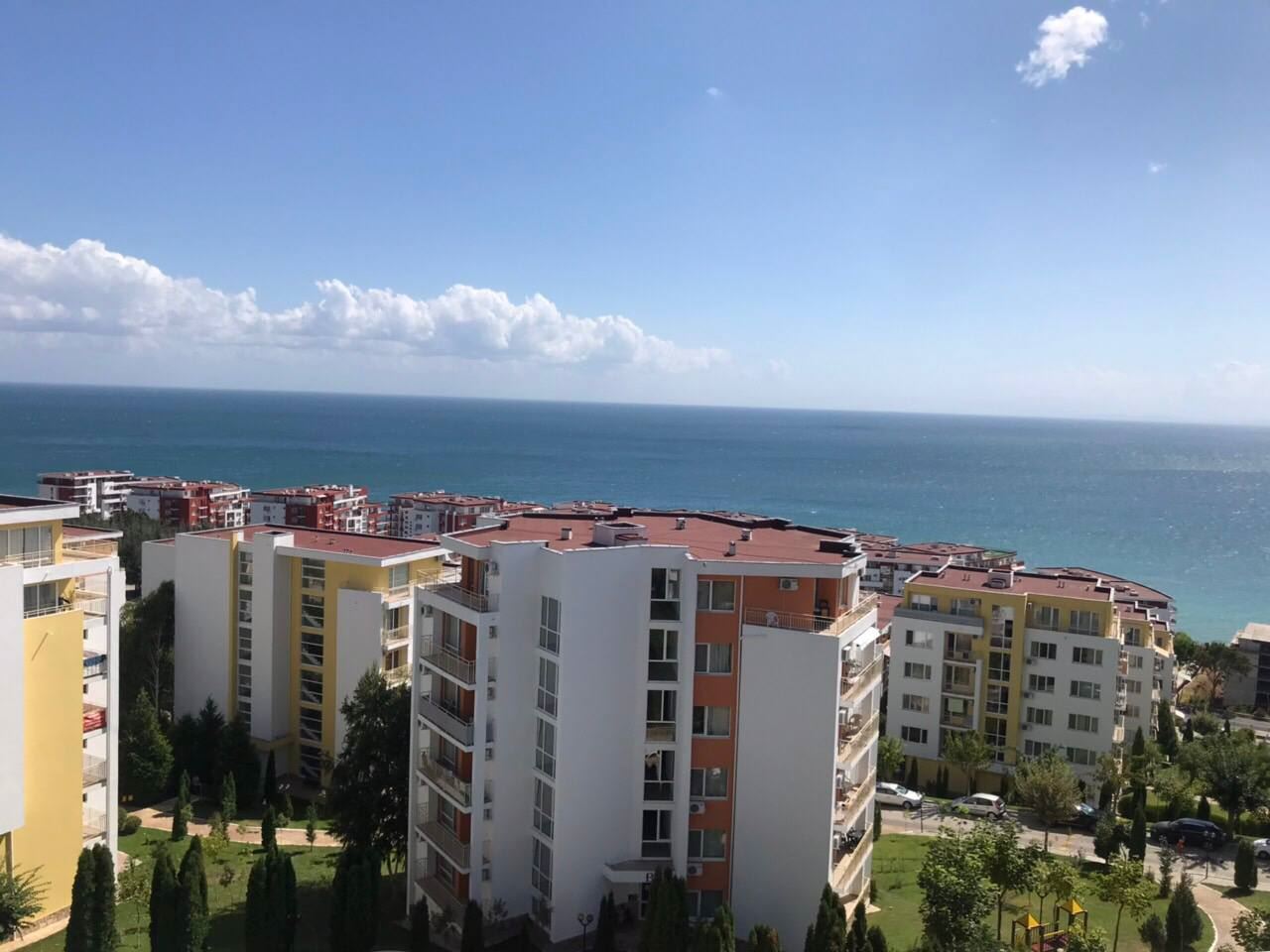 Die Wohnung hat eine Fläche von 60 m² und befindet sich im fünften Stock eines Gebäudes mit Aufzug. Von den Fenstern und dem Balkon aus bietet sich ein wunderbarer Blick auf das Meer und den Komplex, der eine einzigartige Atmosphäre der Ruhe und Gemütlichkeit schafft. Die Wohnung ist vollständig möbliert und mit allen notwendigen Geräten ausgestattet, wodurch sie sofort bezugsfertig ist. Sie besteht aus einem Eingangsbereich, einem Wohnzimmer mit Kochnische, einem Schlafzimmer, einem Badezimmer mit Toilette und zwei Balkonen.