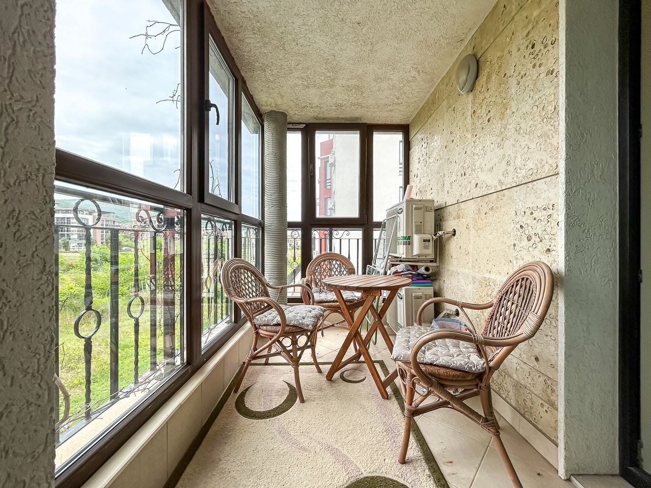 Tolle 2-Zimmer-Wohnung in einem kleinen Komplex in Sveti Vlas. Die Wohnung mit einer Fläche von 49 qm befindet sich im dritten Stock und besteht aus Flur, Wohnzimmer mit Kochnische, Schlafzimmer, Bad mit WC und einem Balkon. Die Wohnung ist komplett mit Möbeln und Geräten ausgestattet, welche im Preis inbegriffen sind. Zur Wohnung gehört ein Keller von 3 qm. Der Komplex verfügt über einen Außenpool, Rezeption, Café, Fitnessraum, Sauna, Jacuzzi, Spielplatz, gut gepflegtes Gelände, Sicherheit, Parkplatz. Die Infrastruktur ist gut ausgebaut.