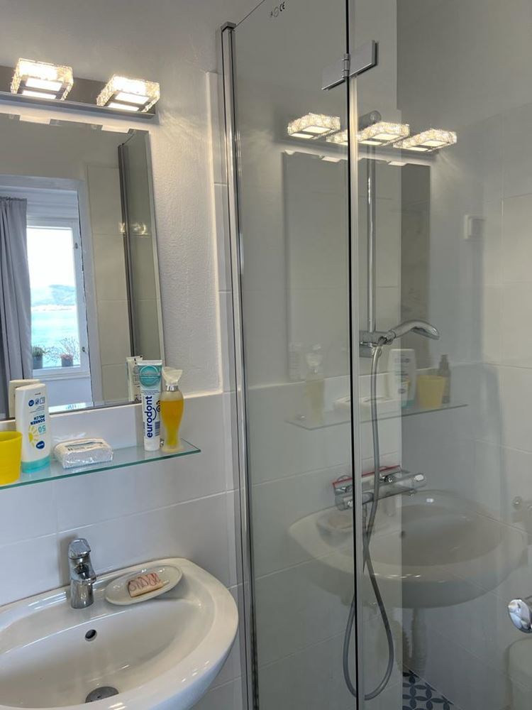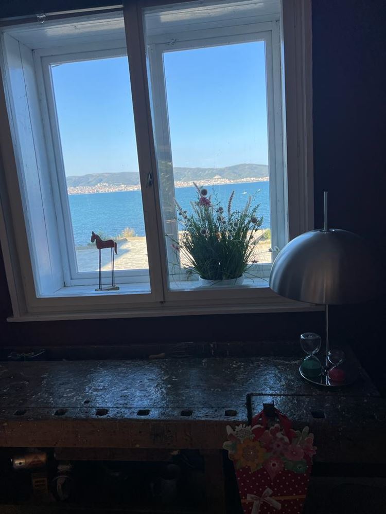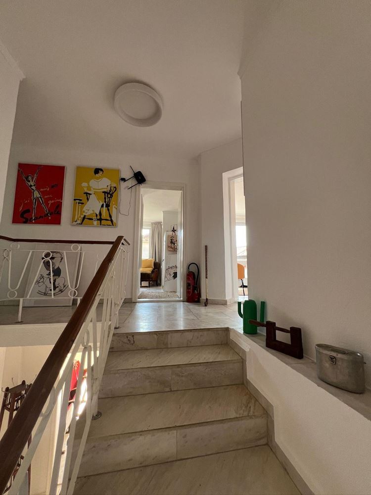 - Im ersten Stock befindet sich ein geräumiges Wohnzimmer mit separater Küche, die einen traumhaften Blick auf das Meer bietet. Auf derselben Etage befindet sich ein großes Zimmer mit eigenem Bad und WC, derzeit als Esszimmer genutzt, mit direktem Zugang zum Garten.