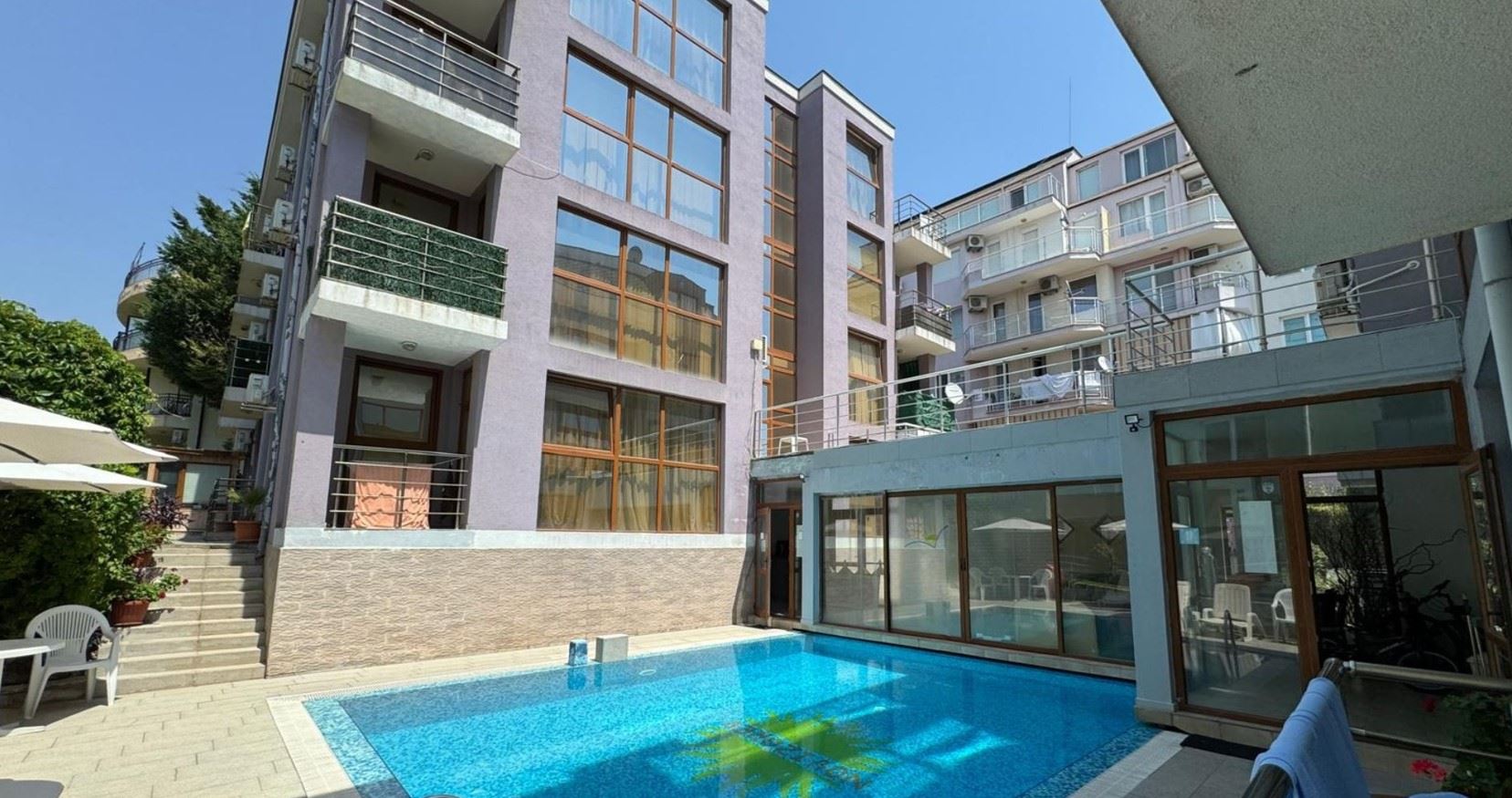 Wir präsentieren Ihnen ein Apartment mit zwei Schlafzimmern mit einer Gesamtfläche von 73 m², gelegen im zweiten Stock von vier in einem gepflegten Komplex mit Pool im prestigeträchtigen Kurort Sveti Vlas. Die Immobilie vereint Funktionalität, Gemütlichkeit und eine ausgezeichnete Lage, wodurch sie sowohl für den Eigenbedarf als auch als Investition geeignet ist.