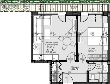 Die Immobilie verfügt über eine Gesamtfläche von 67,61 m², liegt im Erdgeschoss und ist nach Norden ausgerichtet — eine praktische Wahl, die im Sommer für angenehme Kühle sorgt. Die Aufteilung ist funktional und praktisch: geräumiges Wohnzimmer mit Küchenzeile und Zugang zum privaten Garten, gemütliches Schlafzimmer, Badezimmer mit WC, Eingangsbereich und Terrasse. Der private Garten vermittelt das Gefühl eines eigenen Hauses — perfekt für den Morgenkaffee, eine grüne Ecke, einen Spielbereich für Kinder oder einen Platz für Haustiere.
